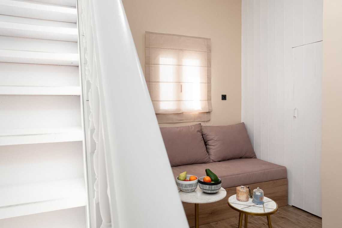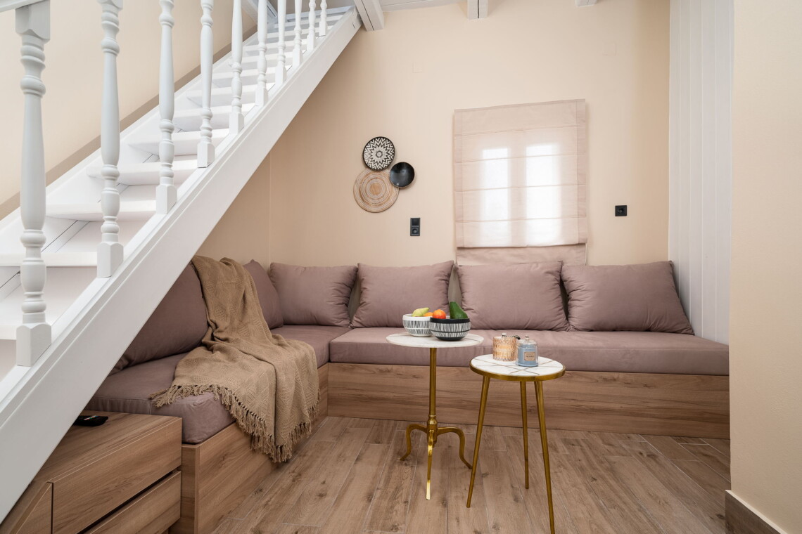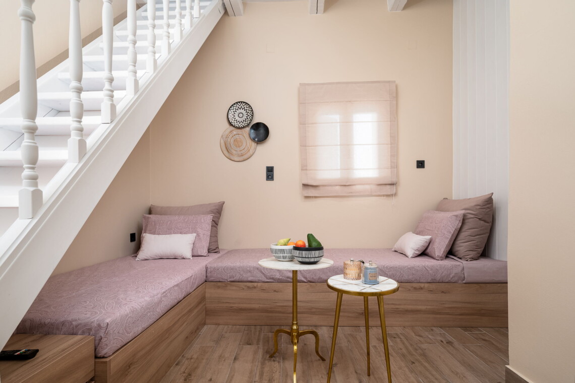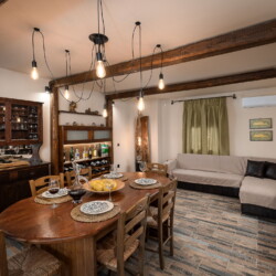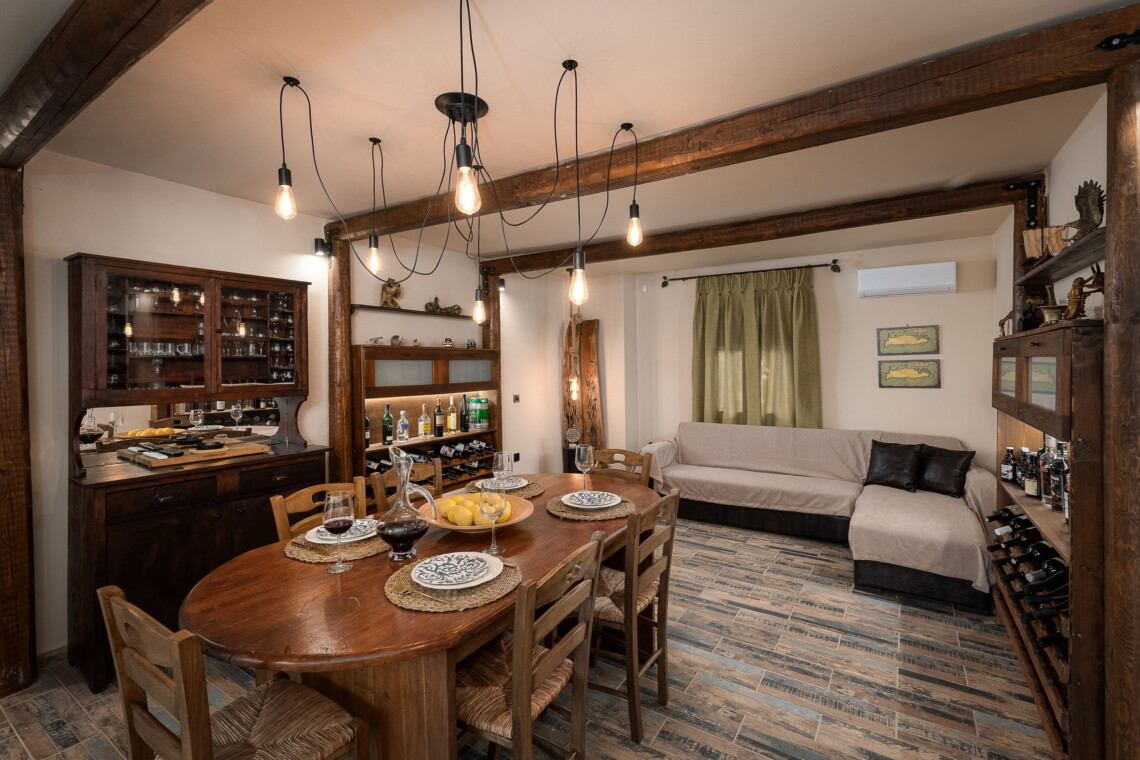 Upstairs, the master bedroom features a comfortable double bed and plenty of natural light. A separate entrance on the ground floor leads to the traditional dining room, complete with a large table, authentic Cretan decor, and a second lounge area with a comfortable couch—perfect for an afternoon siesta.