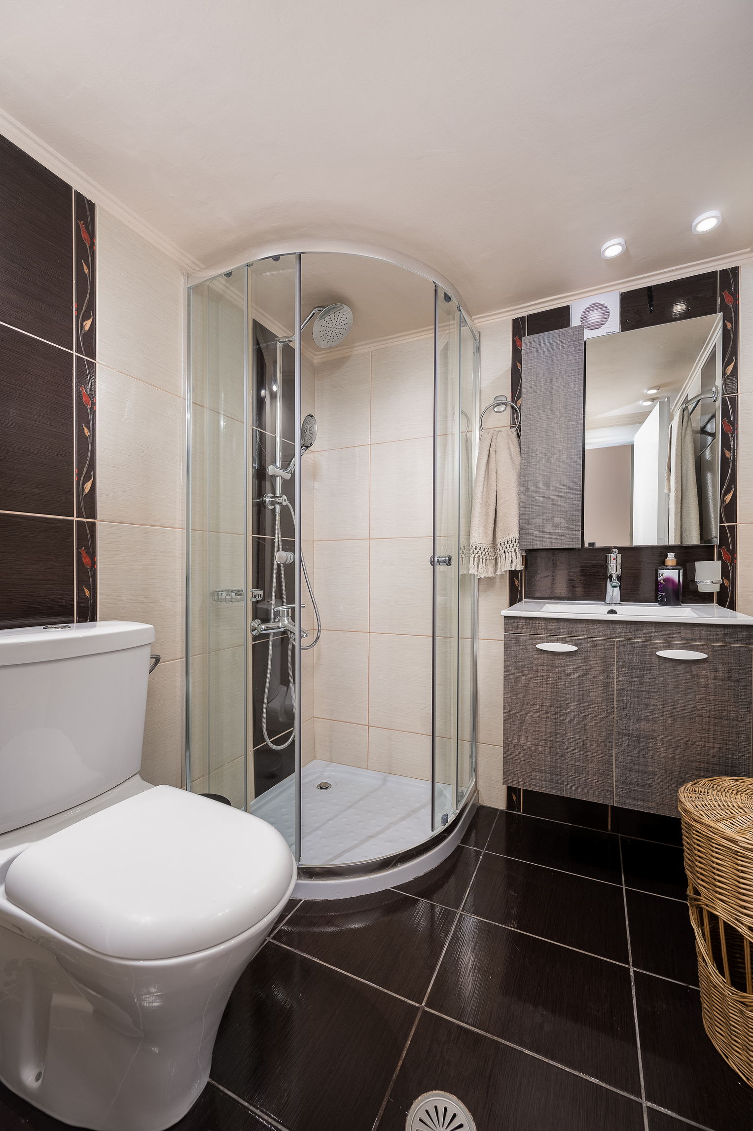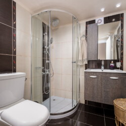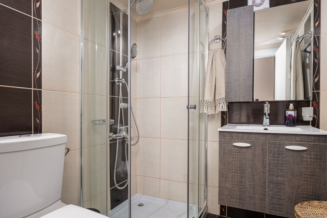 Step inside from the side entrance and into an inviting open-plan kitchen and living area. To the left, you’ll find the first bedroom, where two single beds double as stylish sofas—a perfect extra lounge area. A modern bathroom with a walk-in shower is also located on the ground floor.