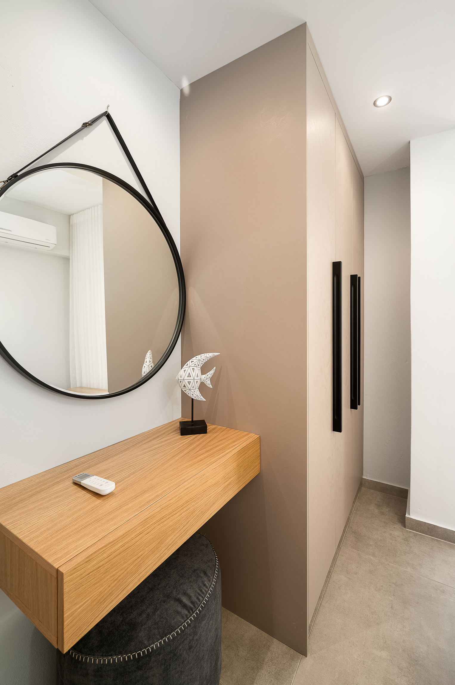 The suite features a spacious bedroom with high-quality bedding, an elegantly designed bathroom, and a modern living area that connects seamlessly to a fully equipped kitchen. The interior boasts a minimalist yet warm aesthetic, with plenty of natural light and thoughtful decorative touches.