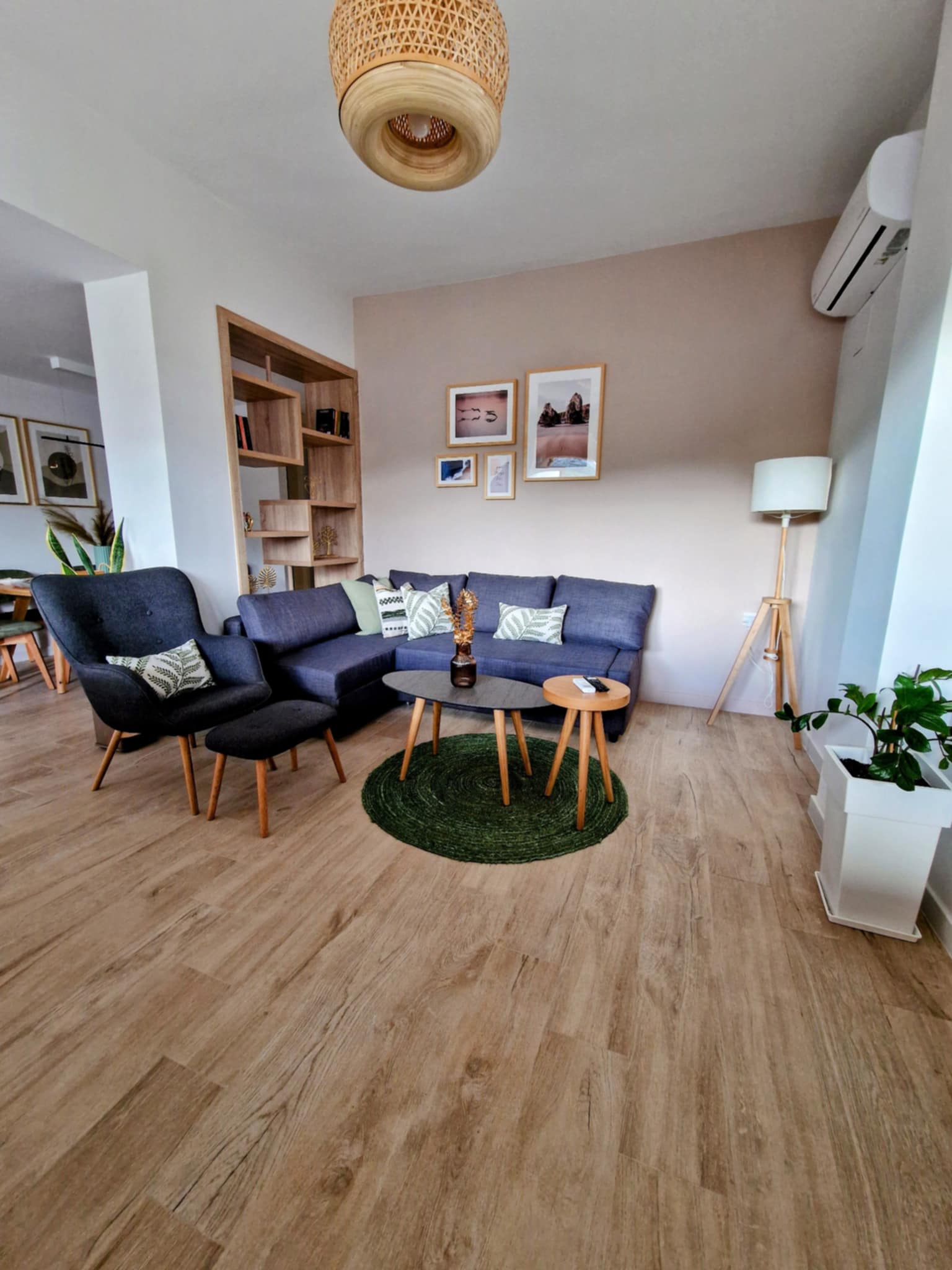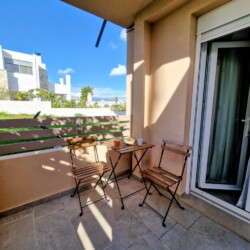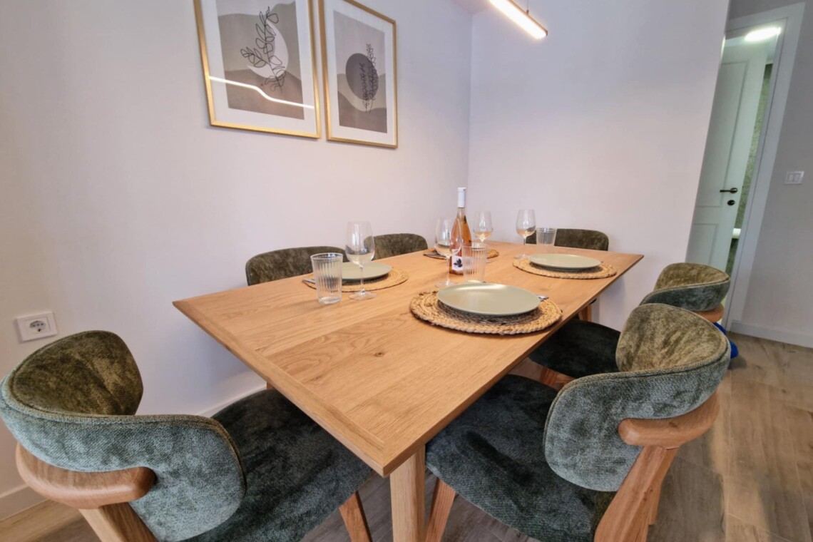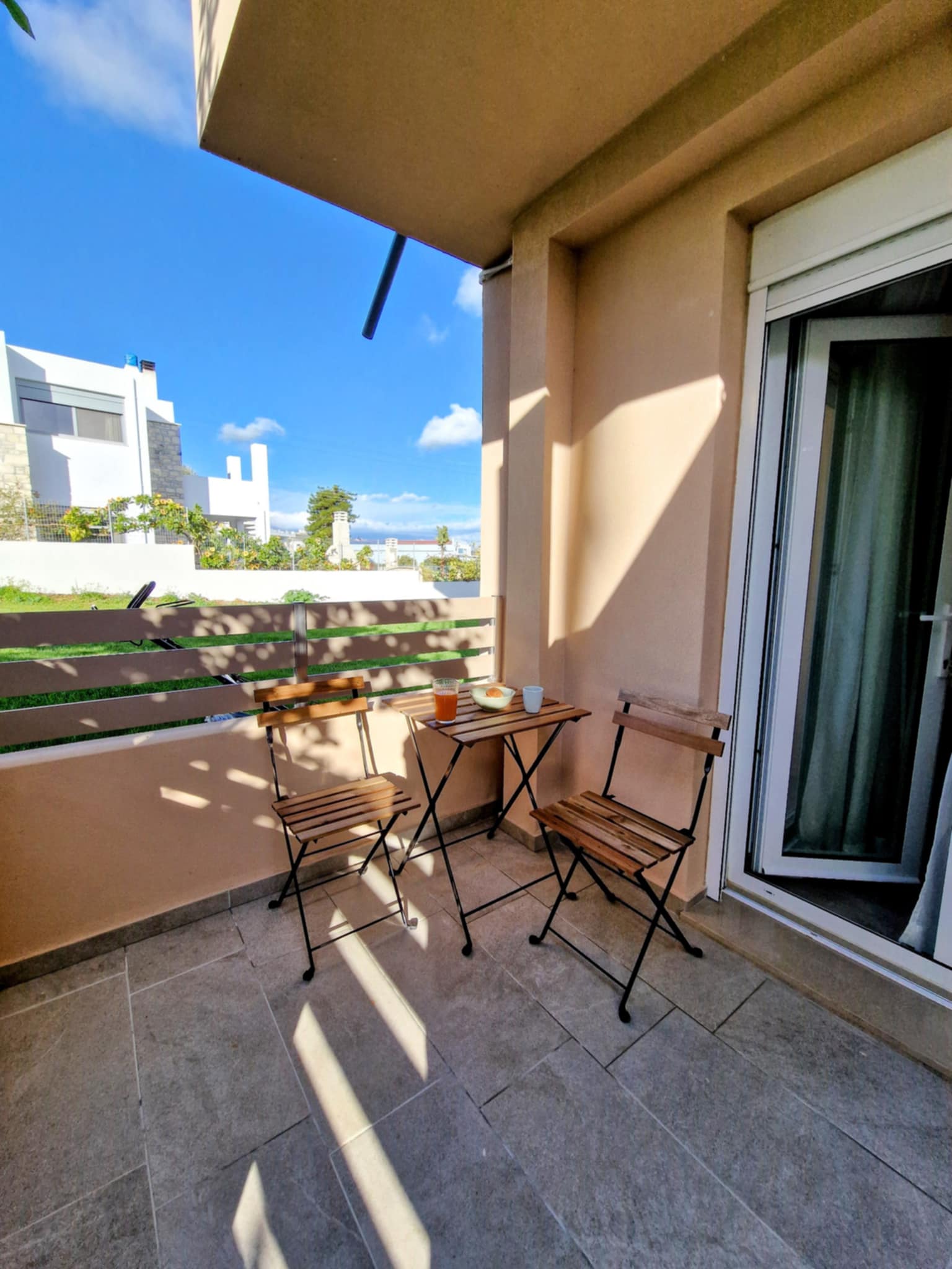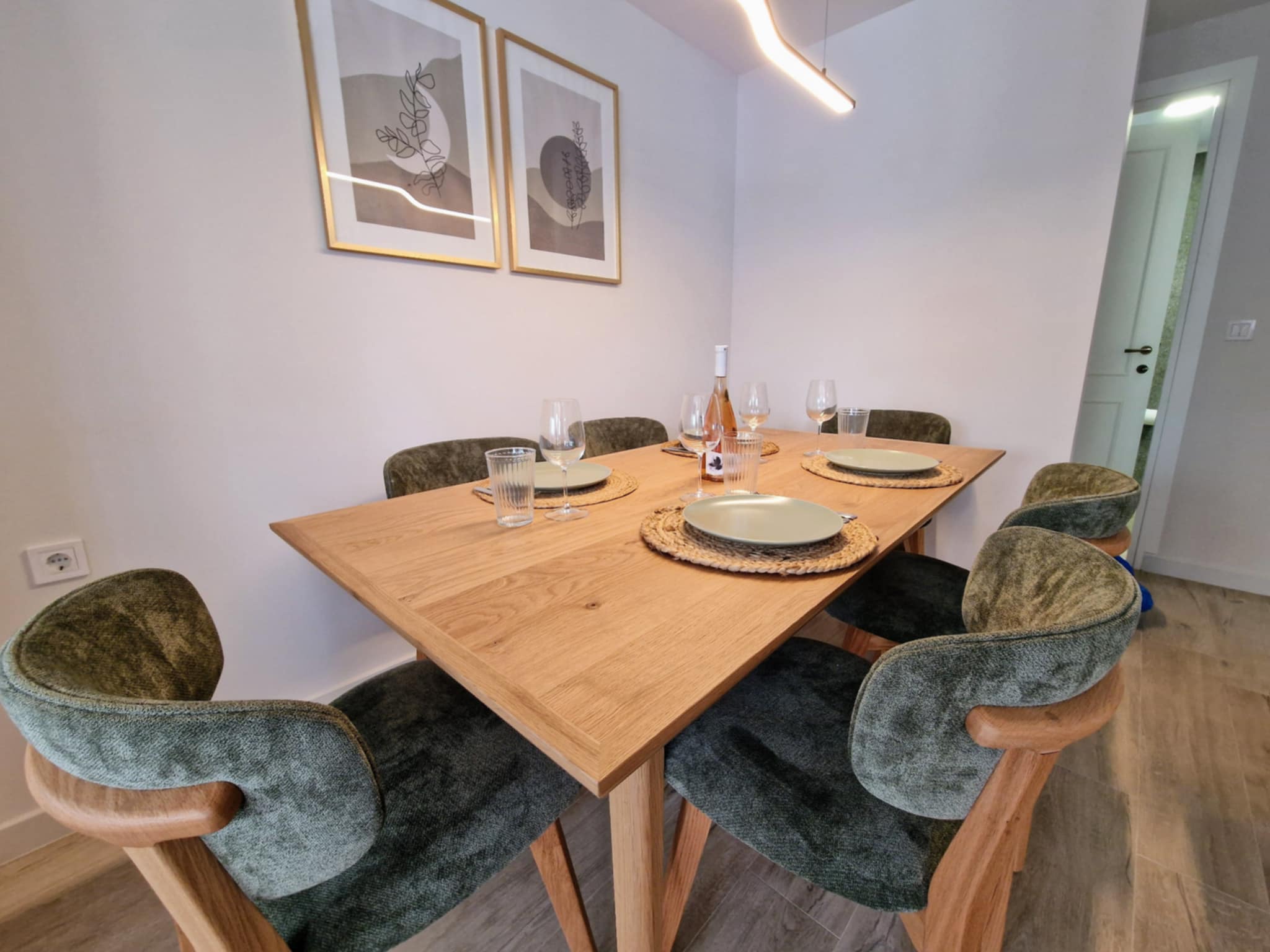 Welcome to this bright and cozy space! As you enter, you’ll find an open-plan layout with a fully equipped kitchen on the left, which leads directly to the main balcony. Here, you’ll find an outdoor dining area with a table and four chairs, perfect for enjoying meals outside. On the right, there’s a stylish dining area that leads to a hallway.