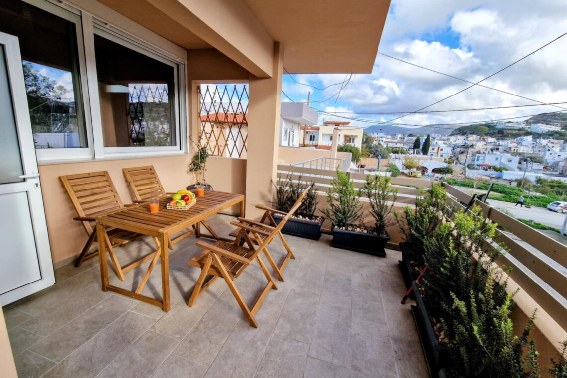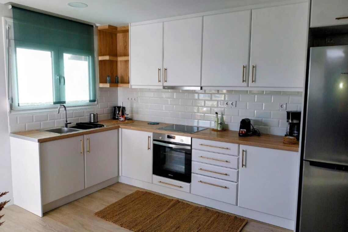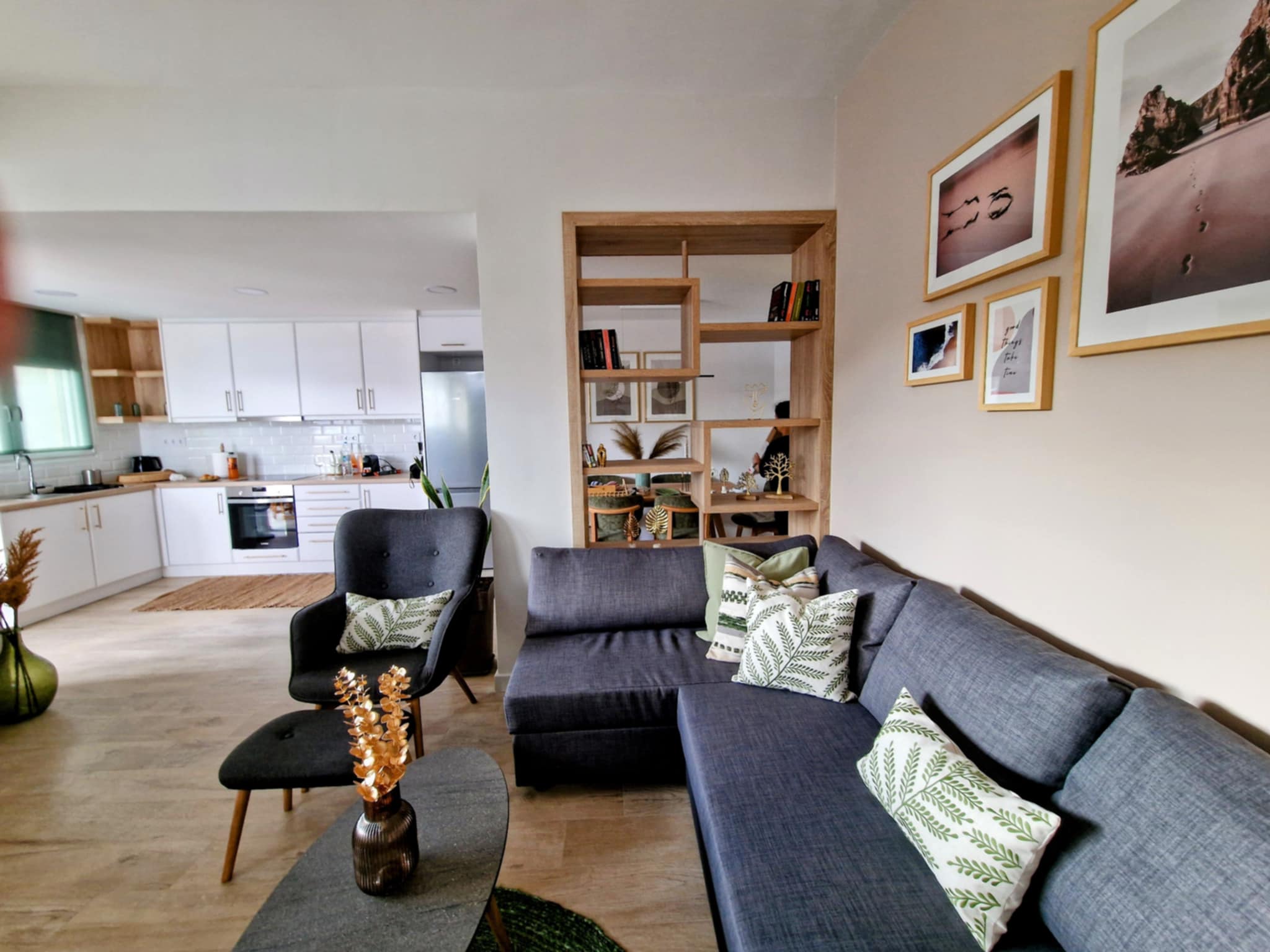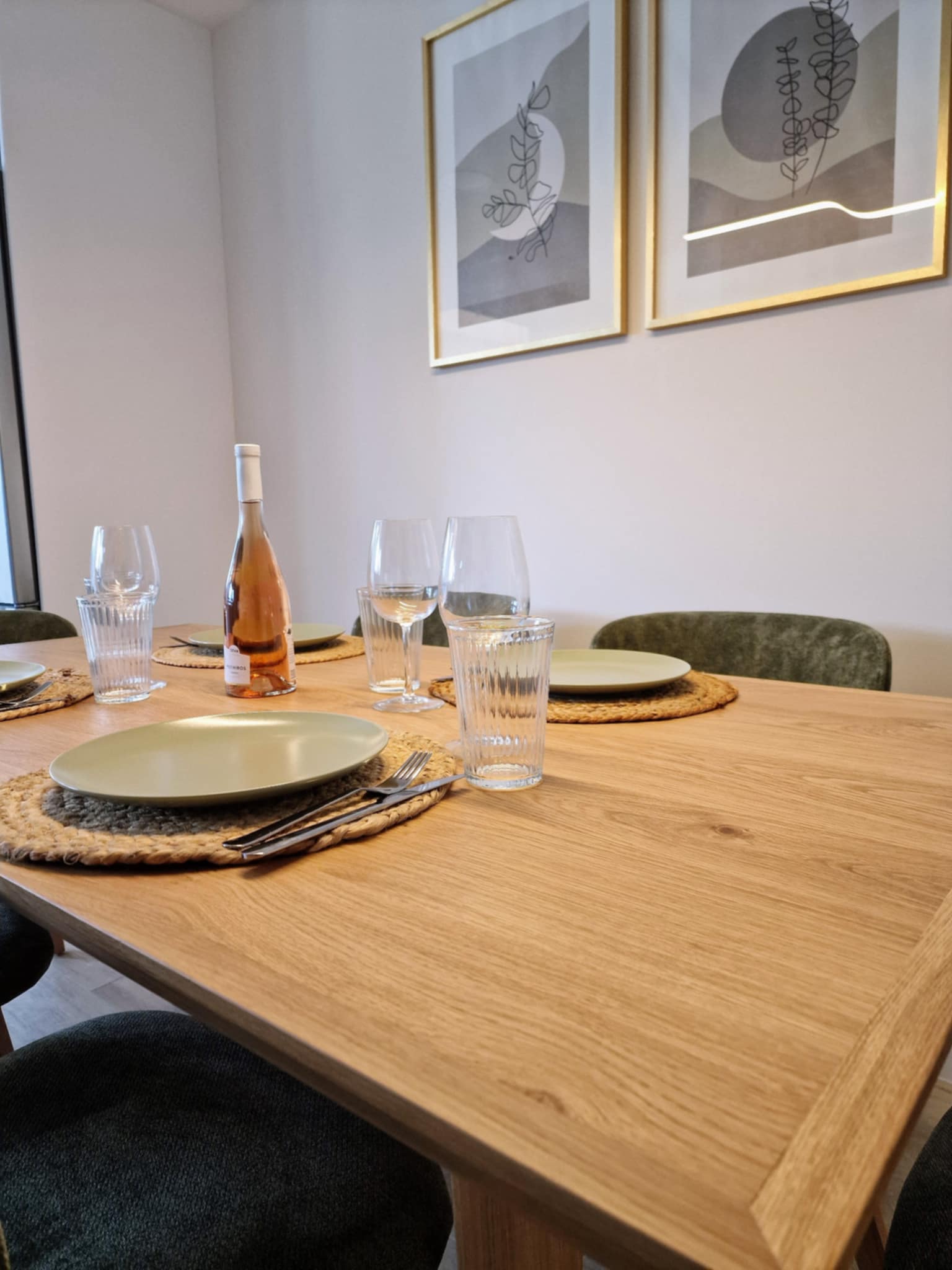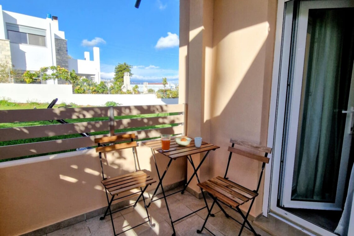 Welcome to this bright and cozy space! As you enter, you’ll find an open-plan layout with a fully equipped kitchen on the left, which leads directly to the main balcony. Here, you’ll find an outdoor dining area with a table and four chairs, perfect for enjoying meals outside. On the right, there’s a stylish dining area that leads to a hallway.