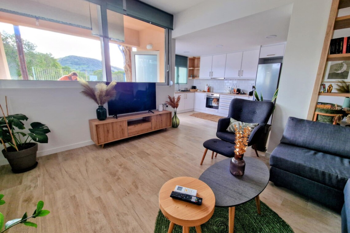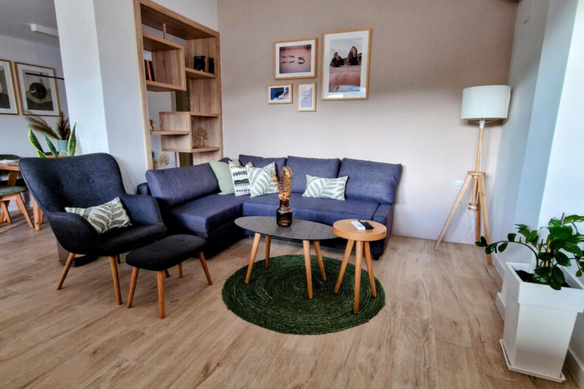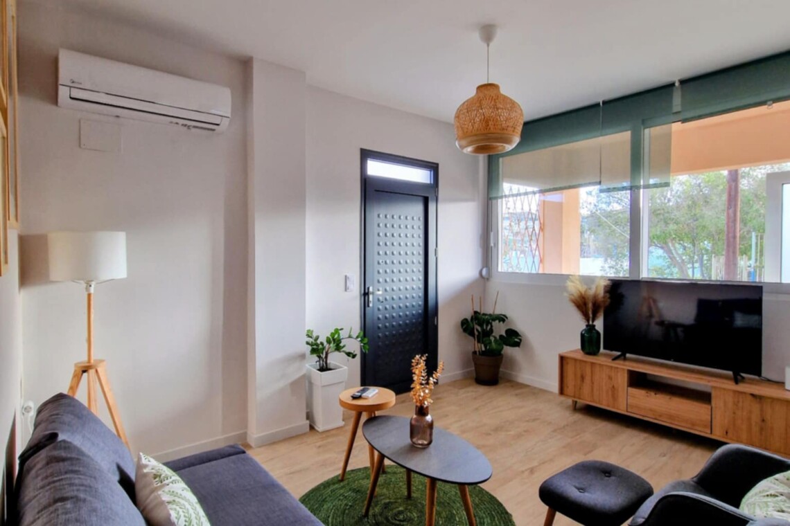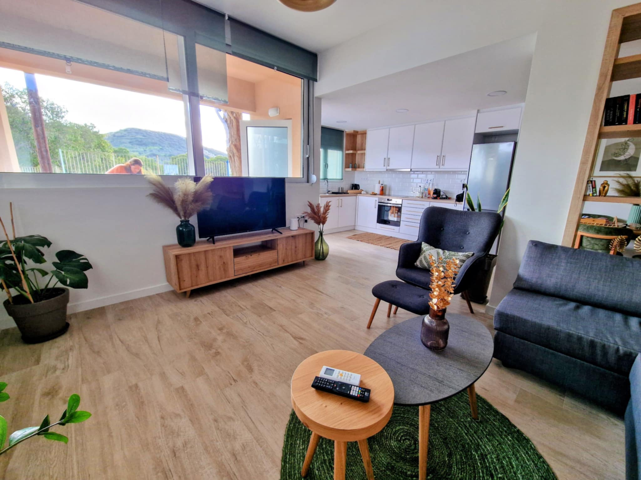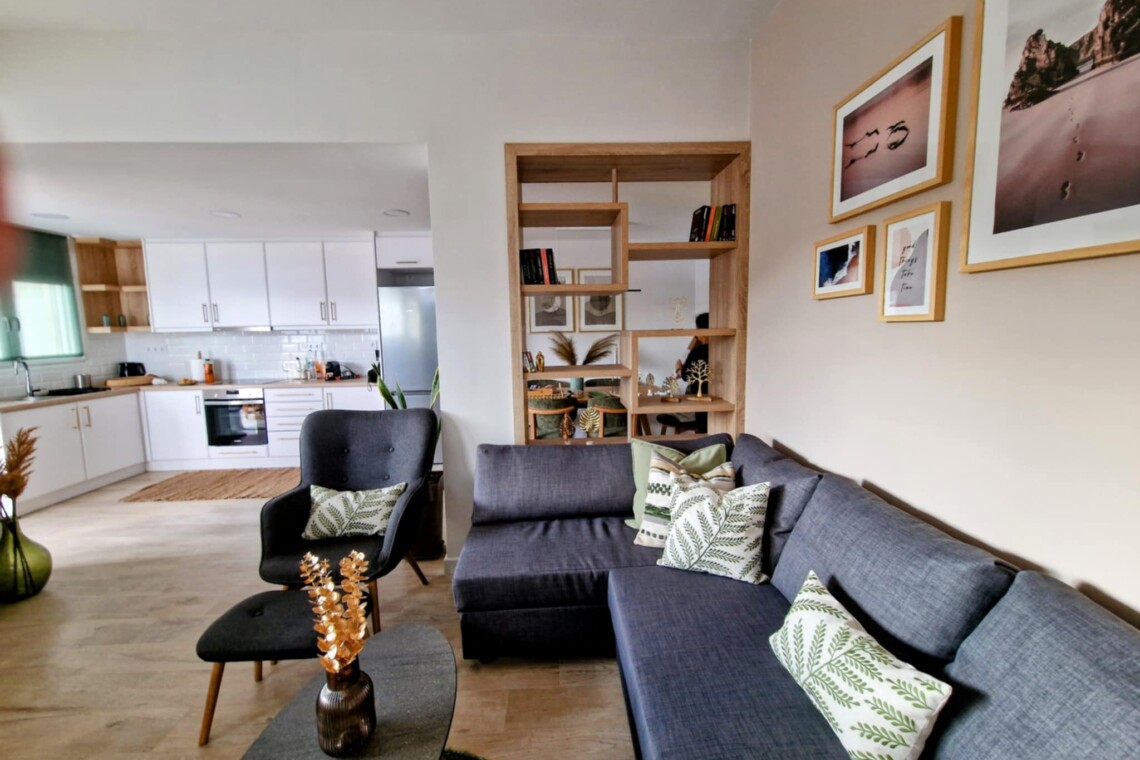 Welcome to this bright and cozy space! As you enter, you’ll find an open-plan layout with a fully equipped kitchen on the left, which leads directly to the main balcony. Here, you’ll find an outdoor dining area with a table and four chairs, perfect for enjoying meals outside. On the right, there’s a stylish dining area that leads to a hallway.
