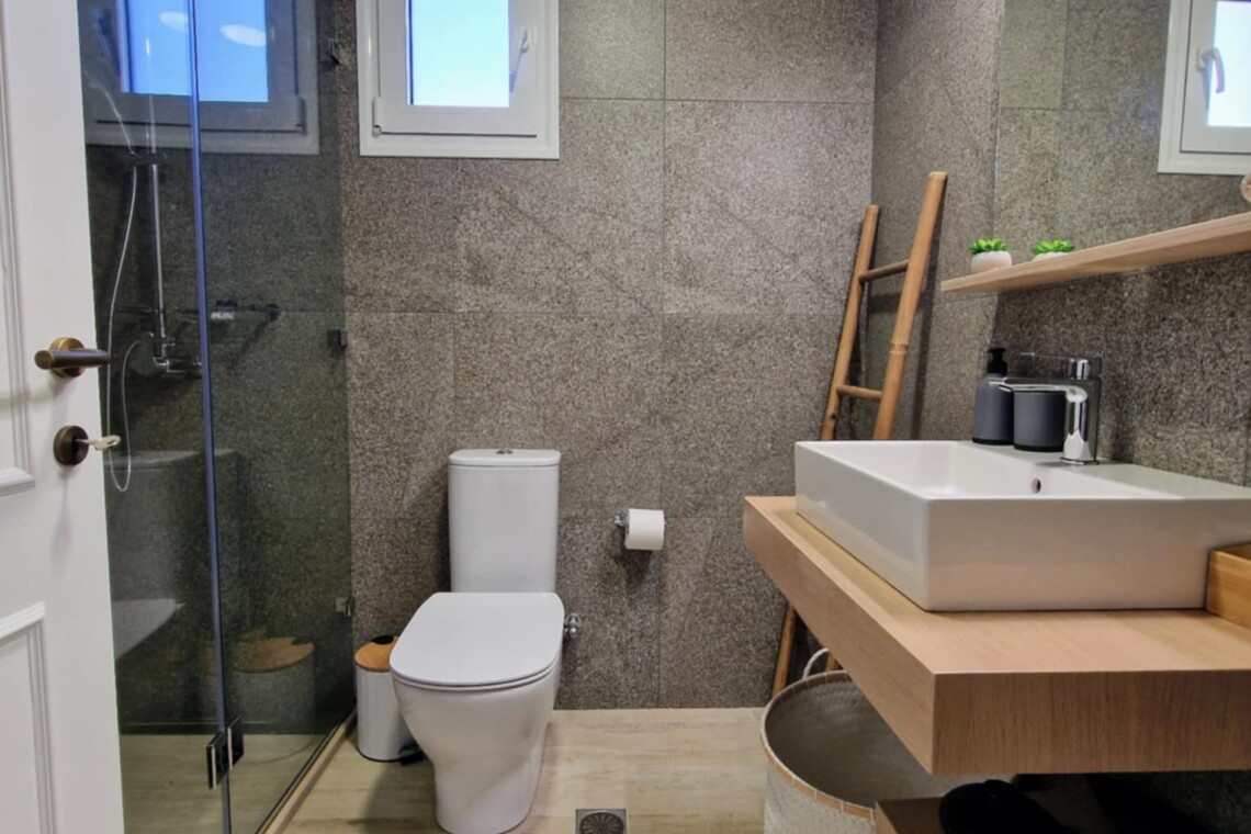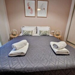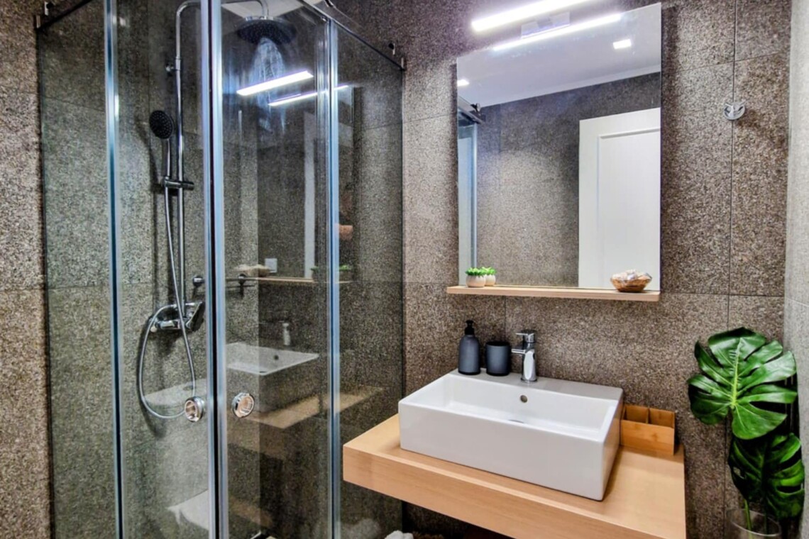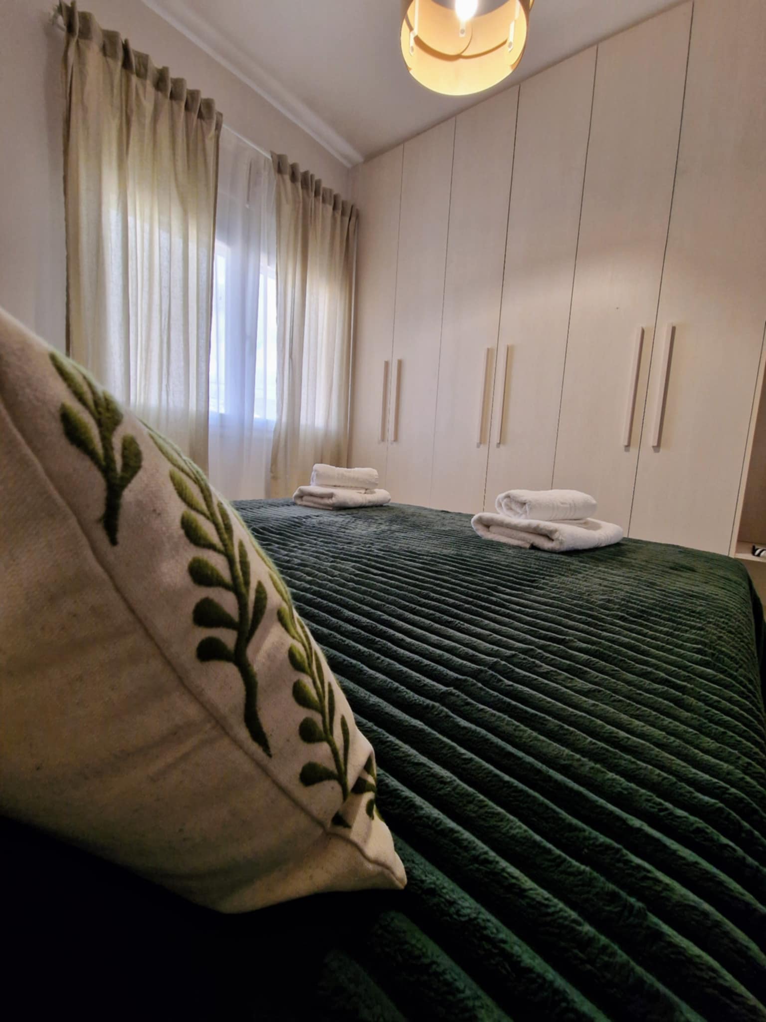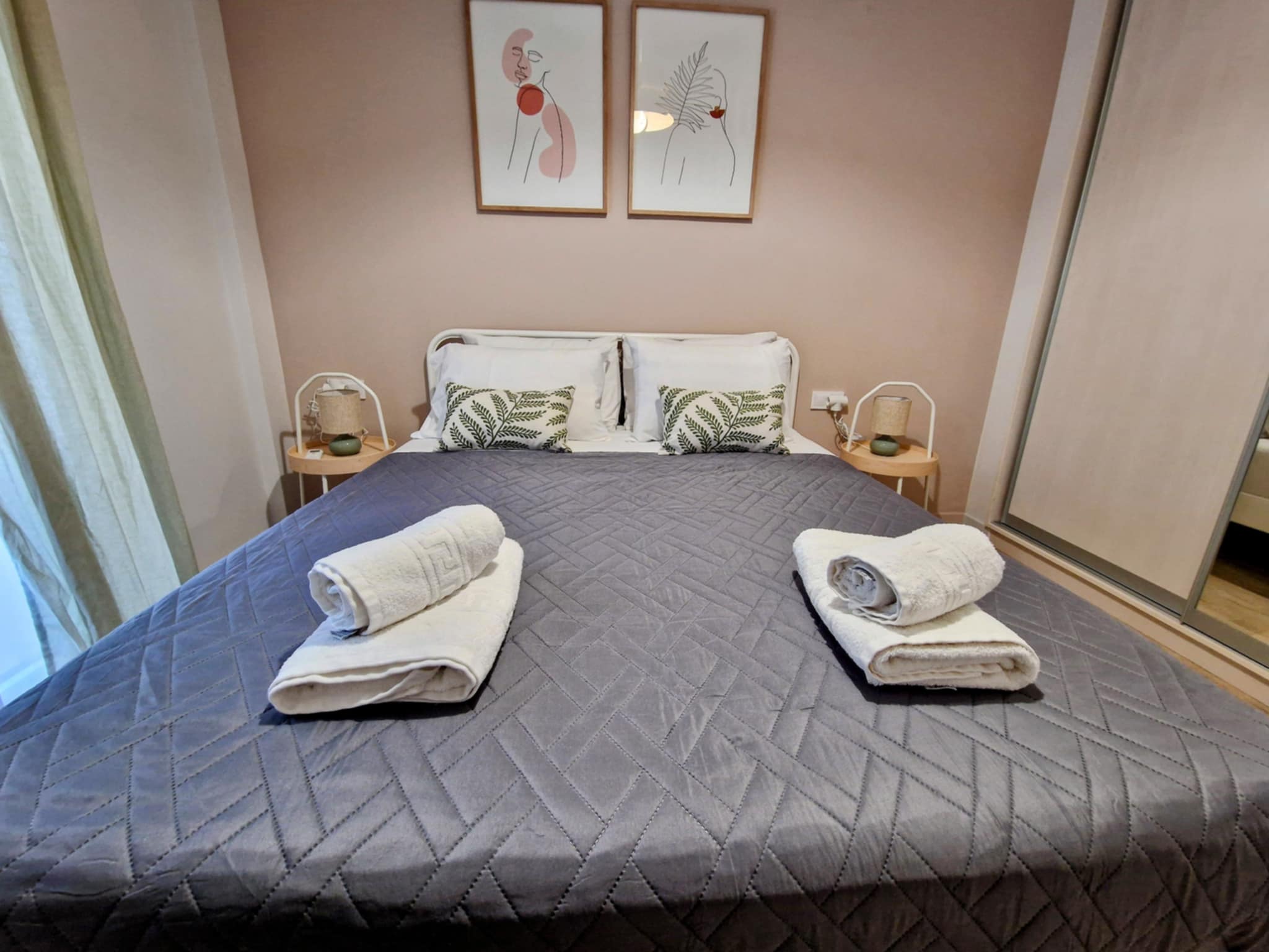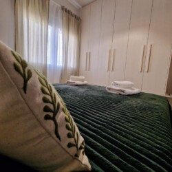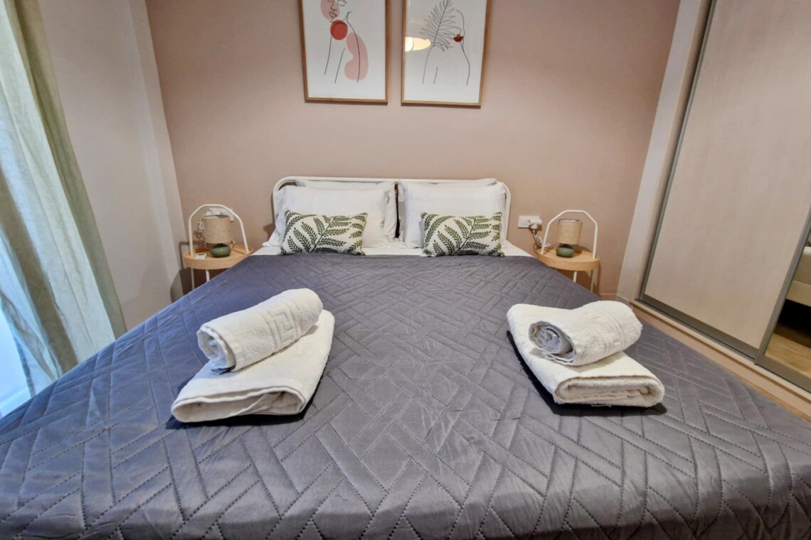 The hallway takes you to two comfortable bedrooms. The first bedroom is to the right, and the main bathroom is straight ahead. To the left, you’ll find the second bedroom, which includes an en-suite bathroom and a private balcony. For added convenience, there’s a washing machine located in the hallway.