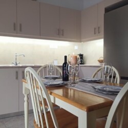 As you step into this charming house, you’re greeted by a sense of warmth and comfort that immediately puts you at ease. The ground floor opens up to a fully equipped kitchen, adorned with modern appliances and bathed in light colors that create a soothing atmosphere. A dining table with four chairs sits invitingly, promising delightful meals and shared conversations.