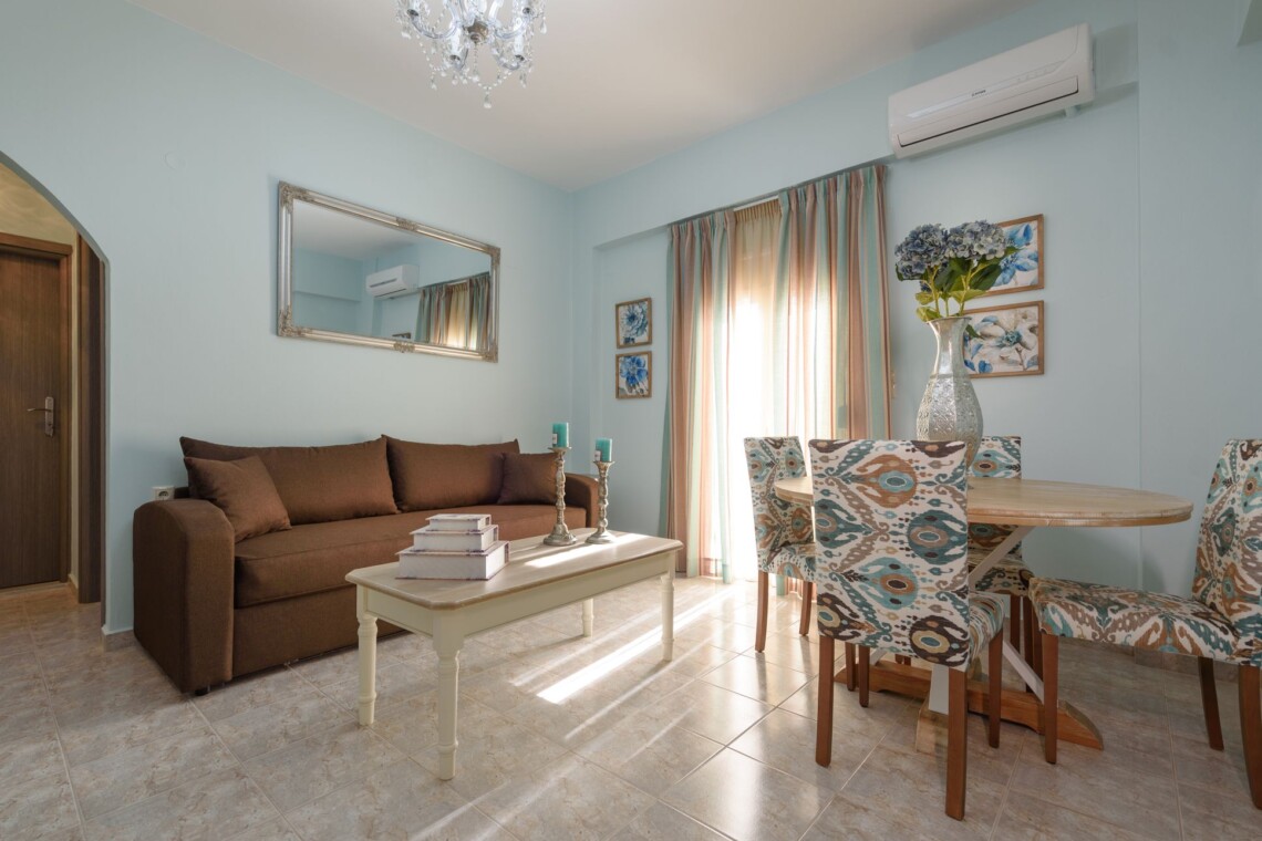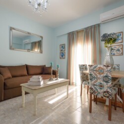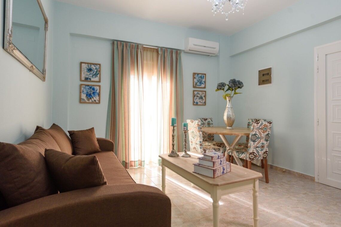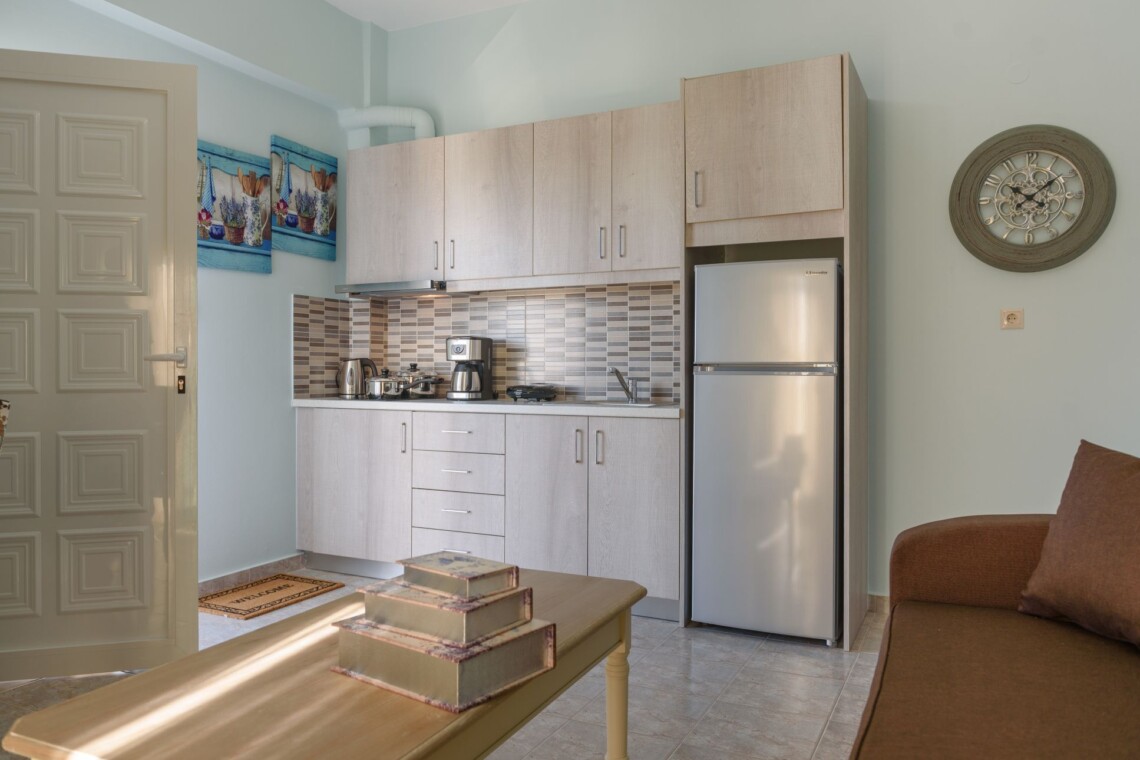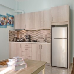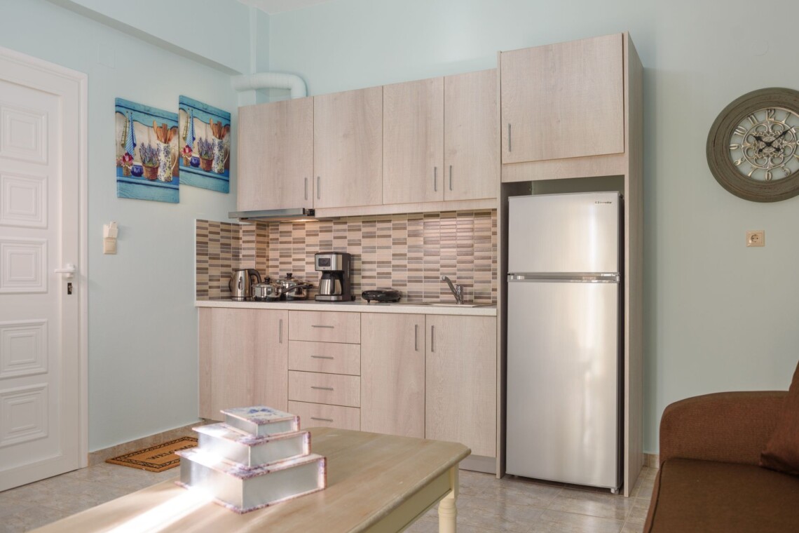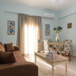 They are all beautifully decorated with handmade furniture, crafted in the Cretan traditional style mixed with modern elements. All apartments come with a fully equipped kitchen with microwave, refrigerator, coffee maker as well as necessary kitchen utensils. Each one has his own private bathroom with shower, hair dryer, towels and washing machine. There is Wi-Fi coverage in each apartment. The individually controlled air conditioning and the smart TV are in the living area.