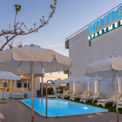 Spyros Apartments with pool is the perfect holiday accommodation for couples, families and groups. The entity consists of 5 different apartments and provides accommodation for up to 20 people in total. The apartments are located on a tranquil part of the village in third line. It is an easy walk to the beach and the center of the village.