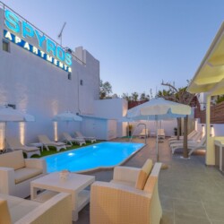Spyros Apartments with pool is the perfect holiday accommodation for couples, families and groups. The entity consists of 5 different apartments and provides accommodation for up to 20 people in total. The apartments are located on a tranquil part of the village in third line. It is an easy walk to the beach and the center of the village.