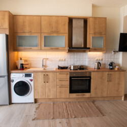 The inviting double bed faces the sea, allowing you to wake up to the soothing sound of the waves. A comfortable couch provides extra sleeping space for two children, making it an ideal escape for couples or small families. The fully equipped kitchen offers everything you need to prepare meals, while the modern bathroom, featuring sleek finishes, adds a touch of luxury to your stay.