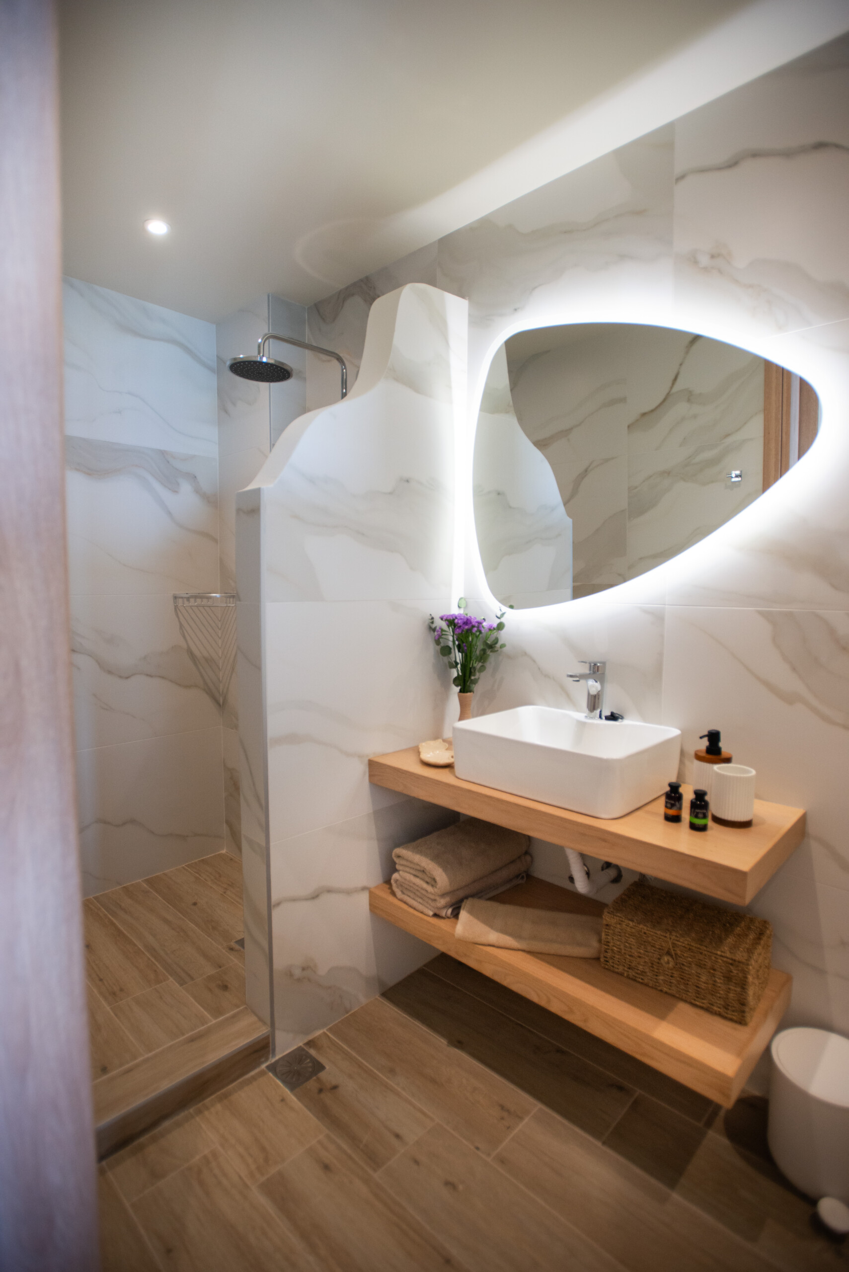 Step into Studio Meltemi, a tranquil beachfront retreat in the heart of Matala, where the colors of the sea blend seamlessly with the warm, earthy tones of the interior. This elegant studio is designed with soft beige, natural wood accents, and deep blue details that mirror the mesmerizing views of the Mediterranean just outside your window. The space is bathed in natural light, enhanced by dark shadings that perfectly balance brightness and privacy.
