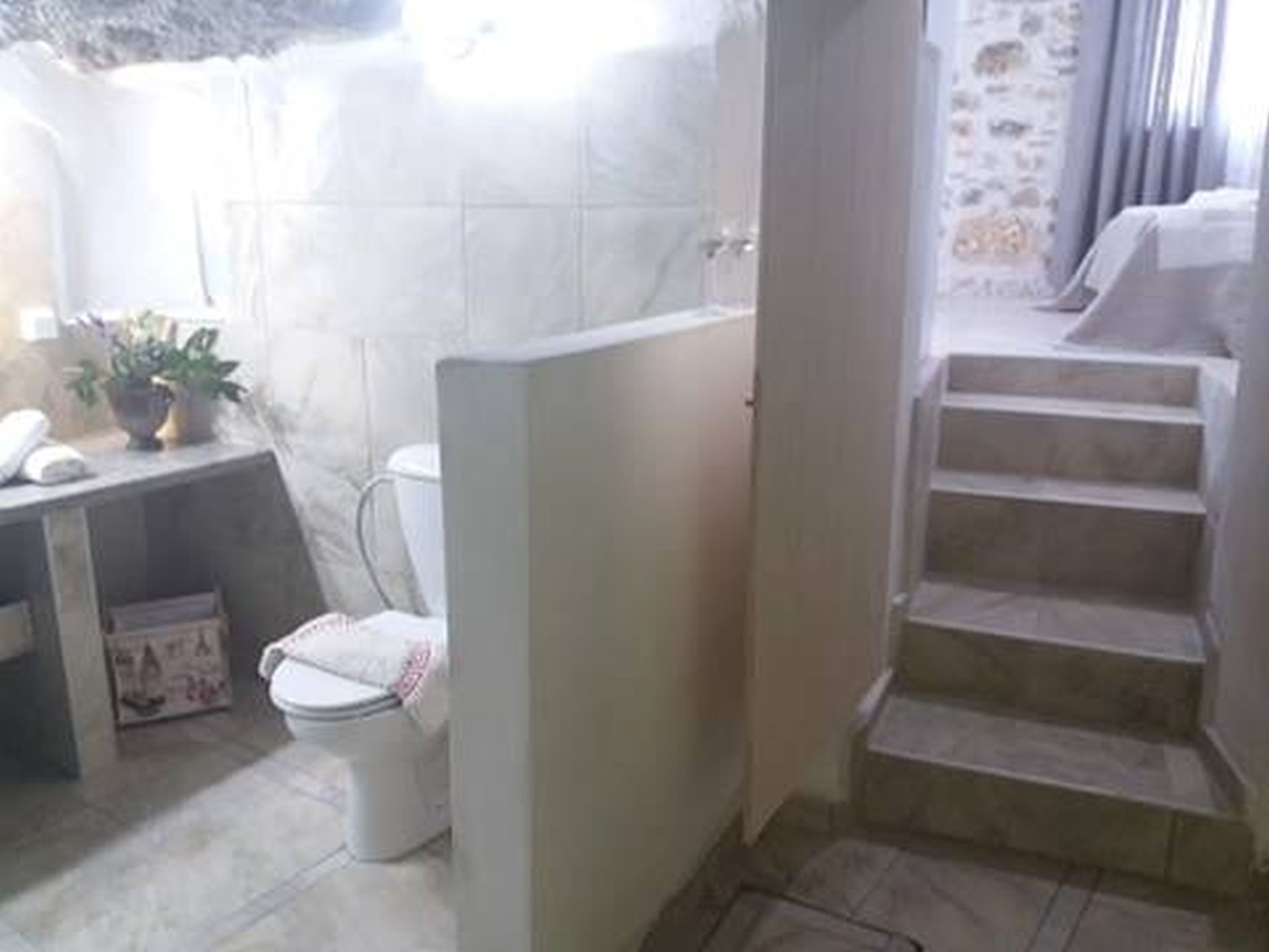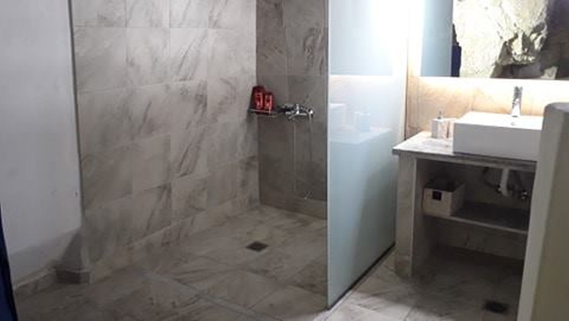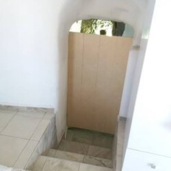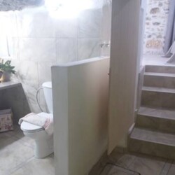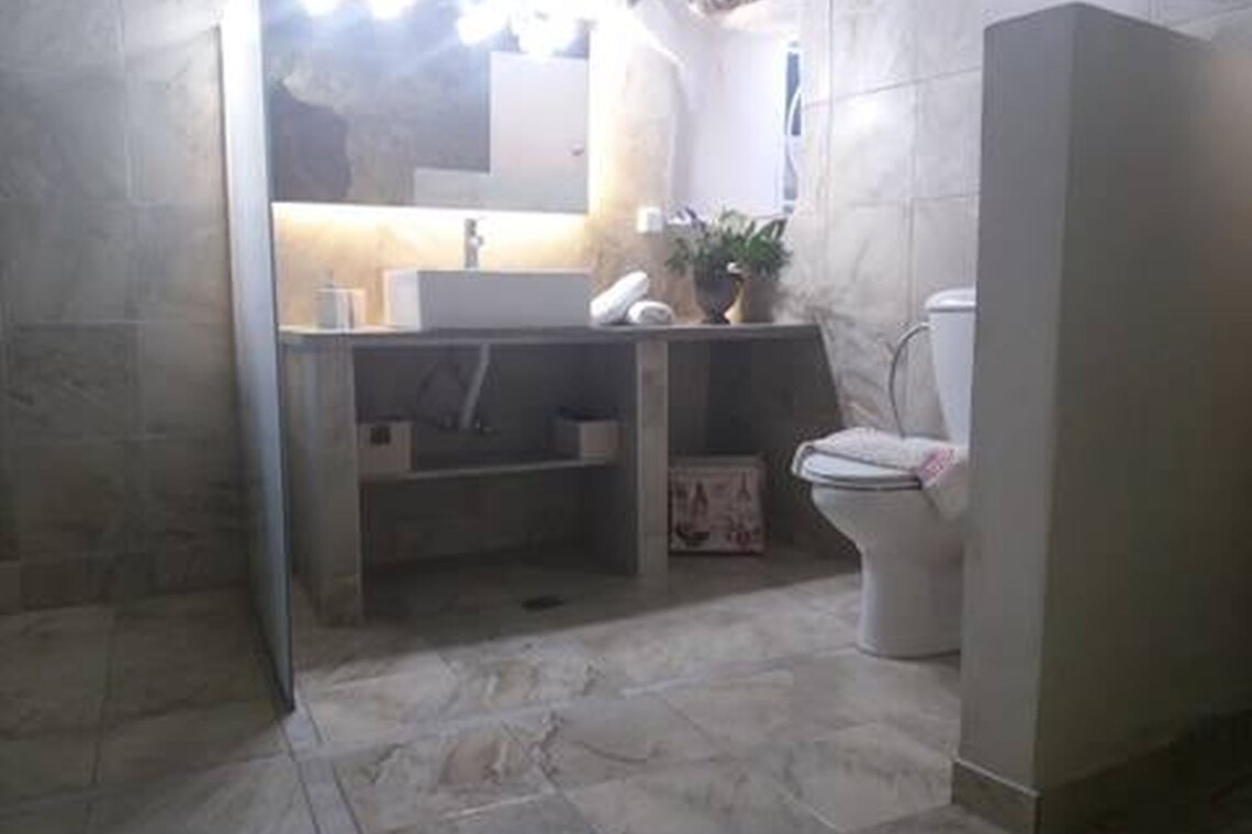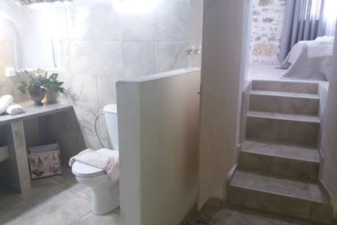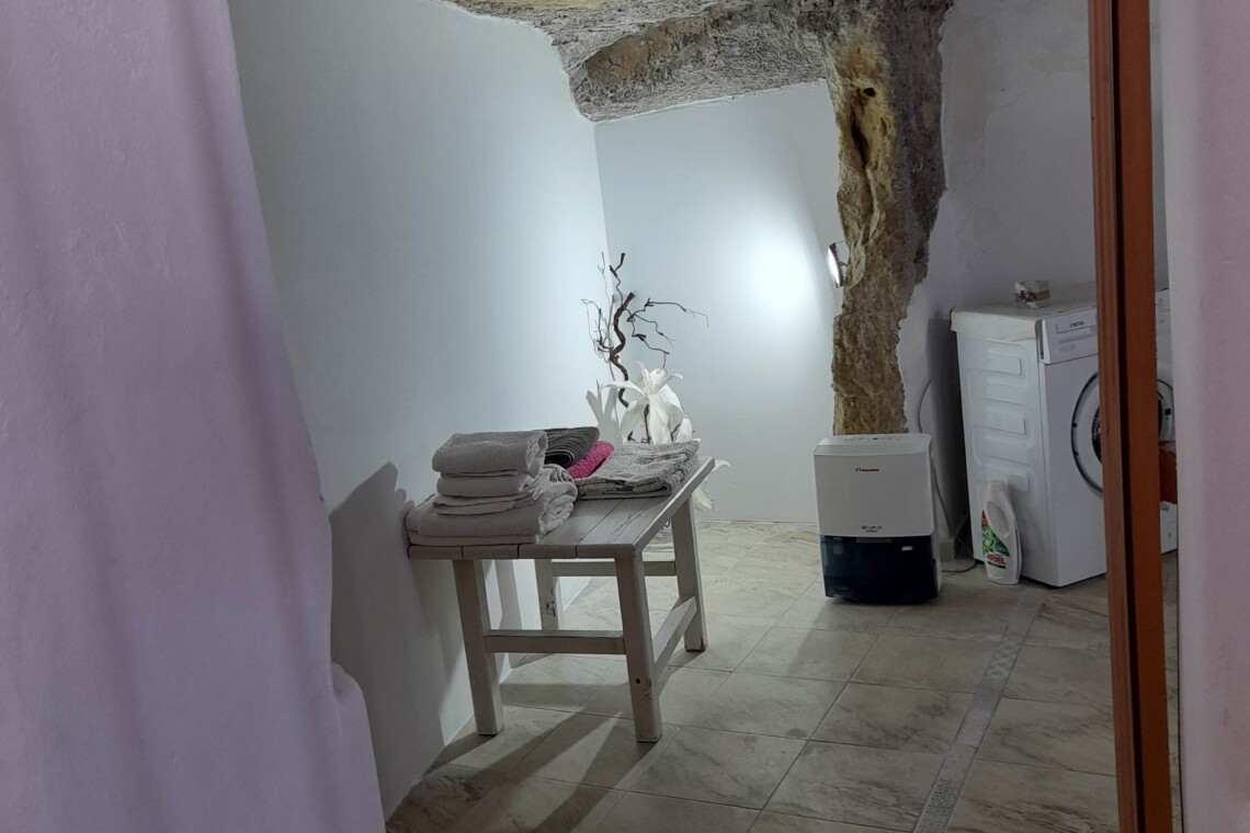 - A few steps down lead to a cave-style modern bathroom, featuring a walk-in shower, toilet, and washing machine for your convenience.