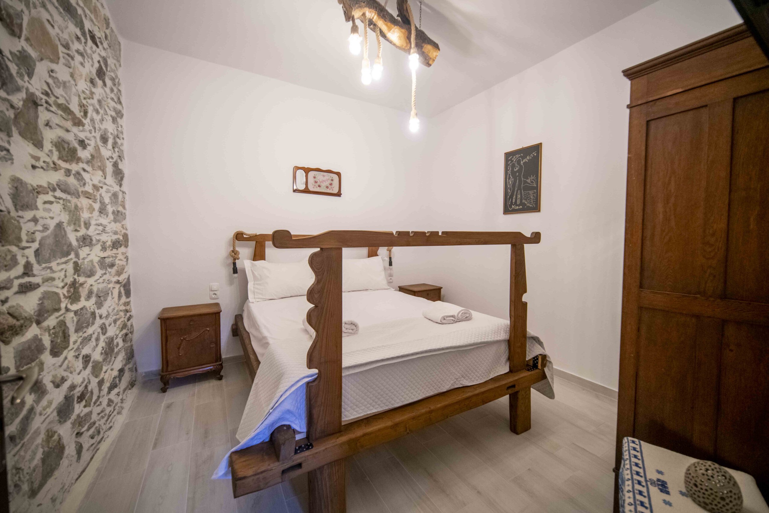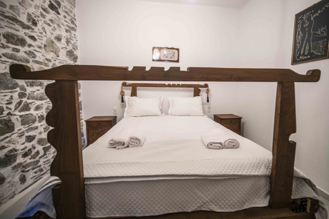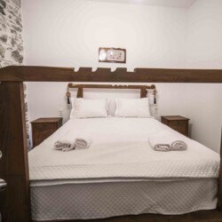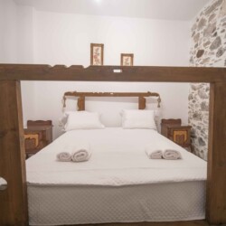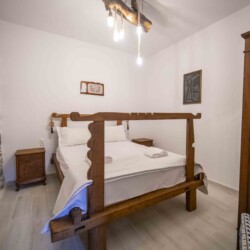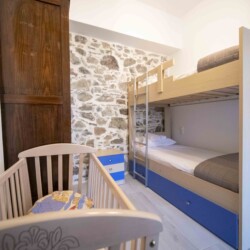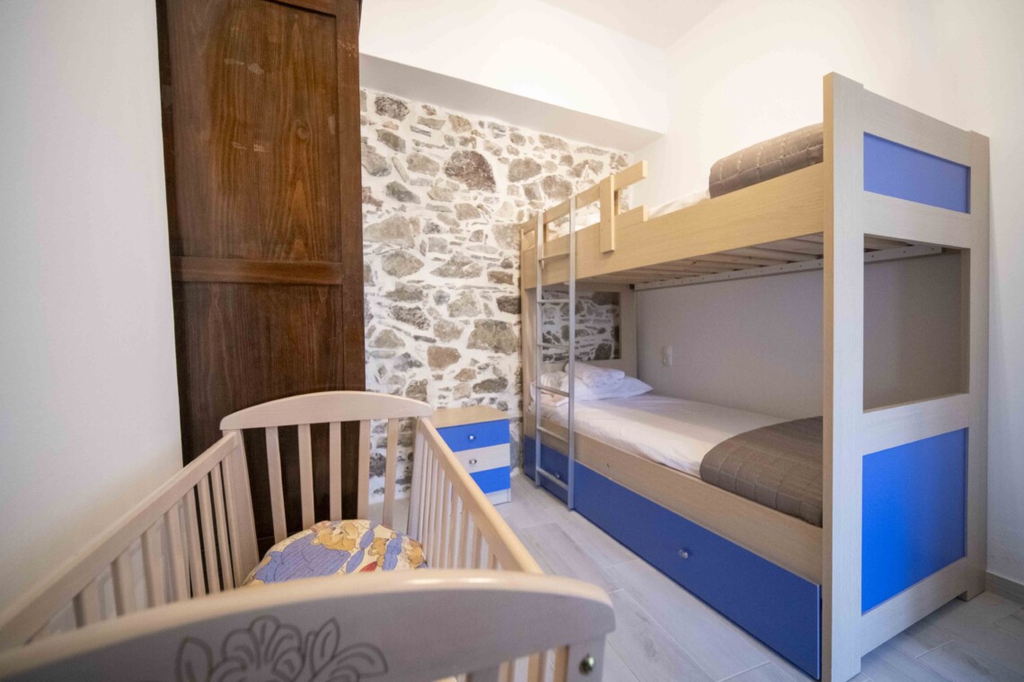 To the left of the entrance is the first bedroom, featuring a cozy bunk bed, perfect for children or additional guests. Adjacent to it, you’ll find the second bedroom, boasting a comfortable double bed crafted from wood sourced from traditional Cretan handlooms. The third bedroom, situated next to the second, offers another serene space for relaxation, with its double bed also made from wood from traditional Cretan handlooms.