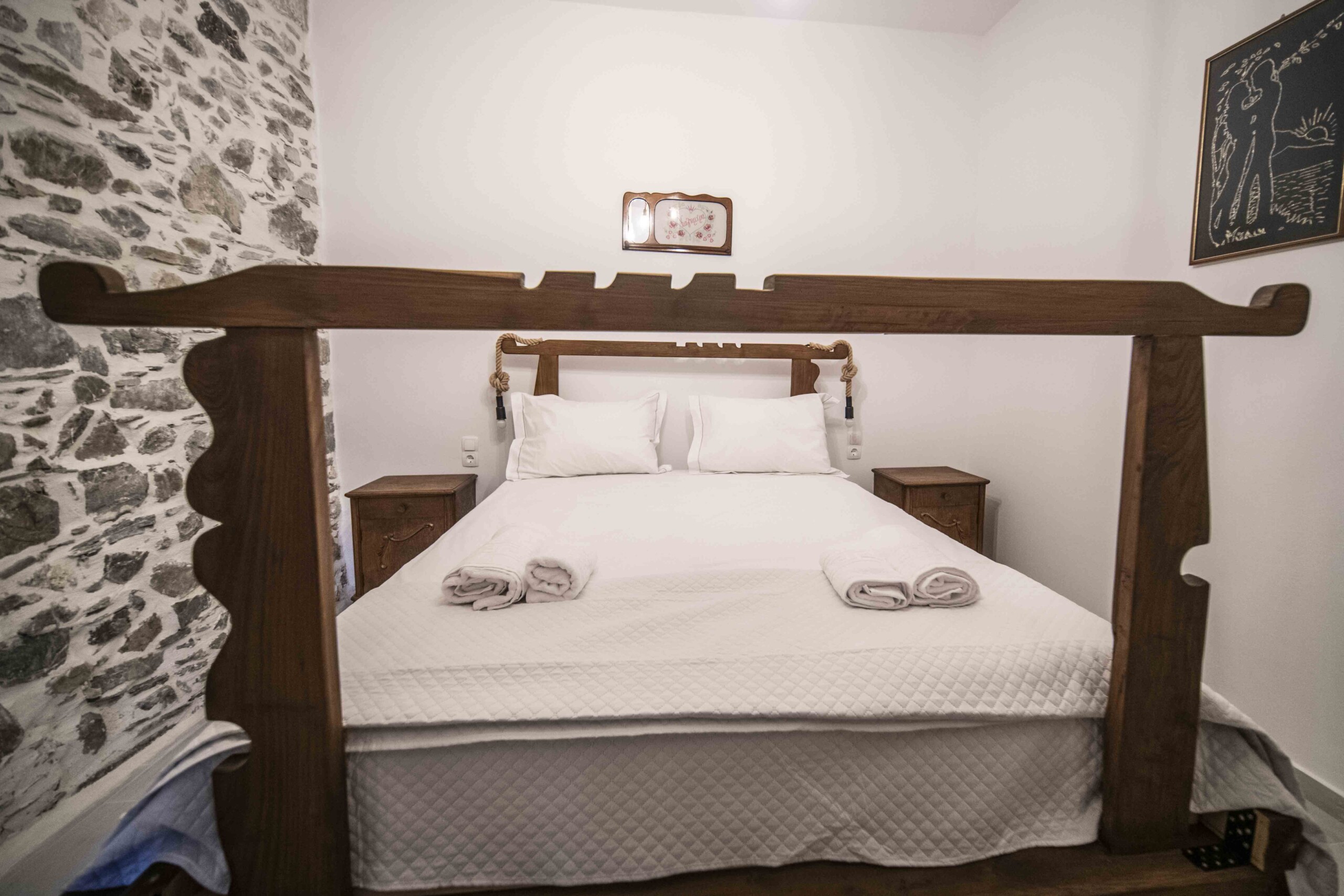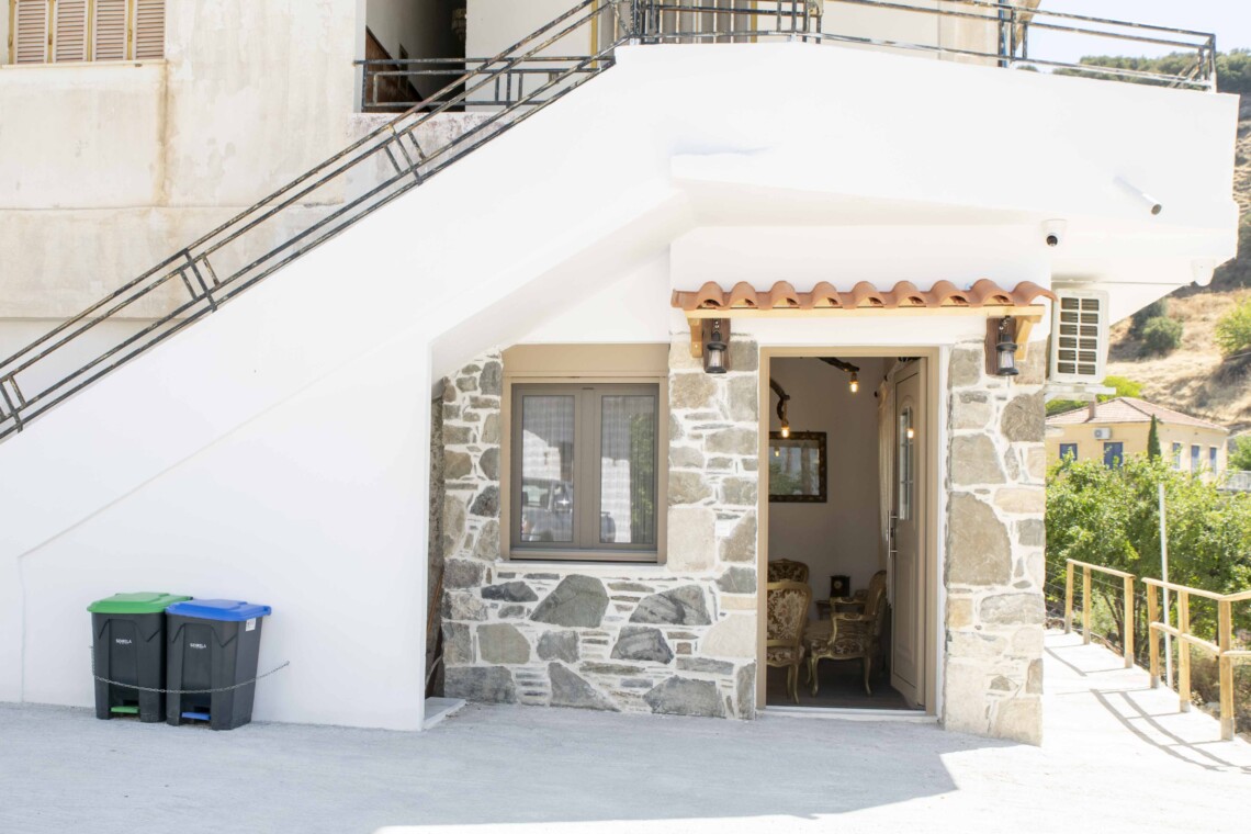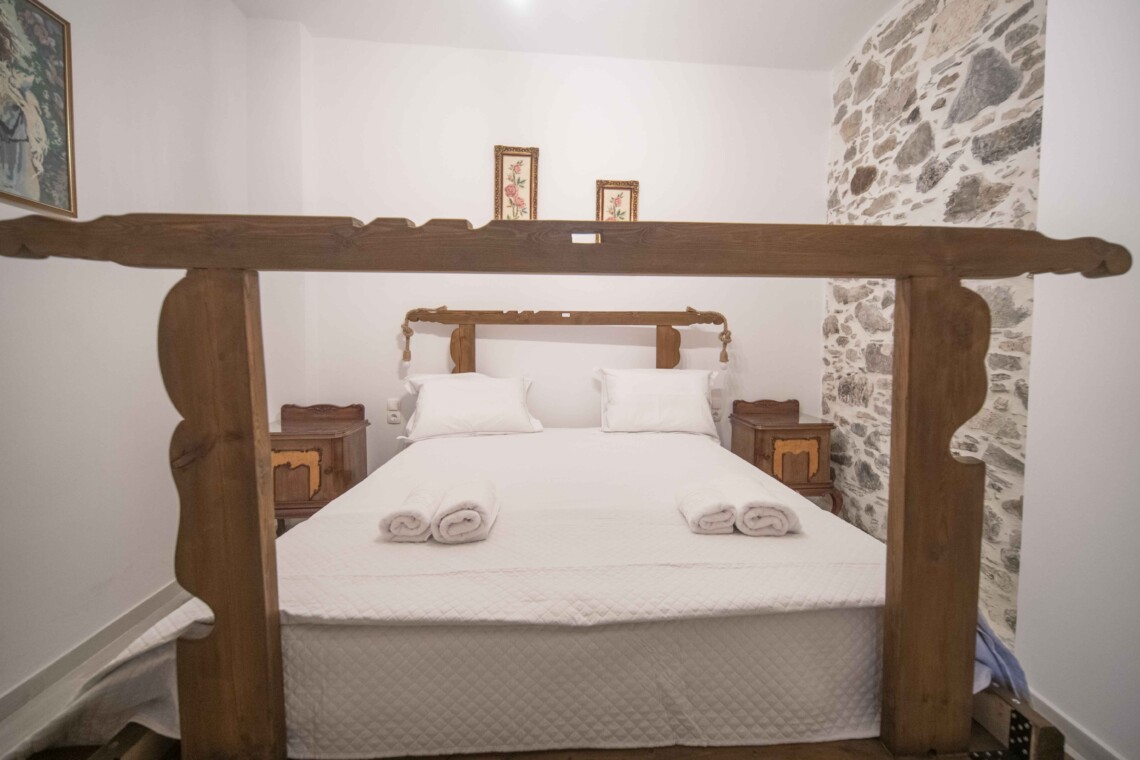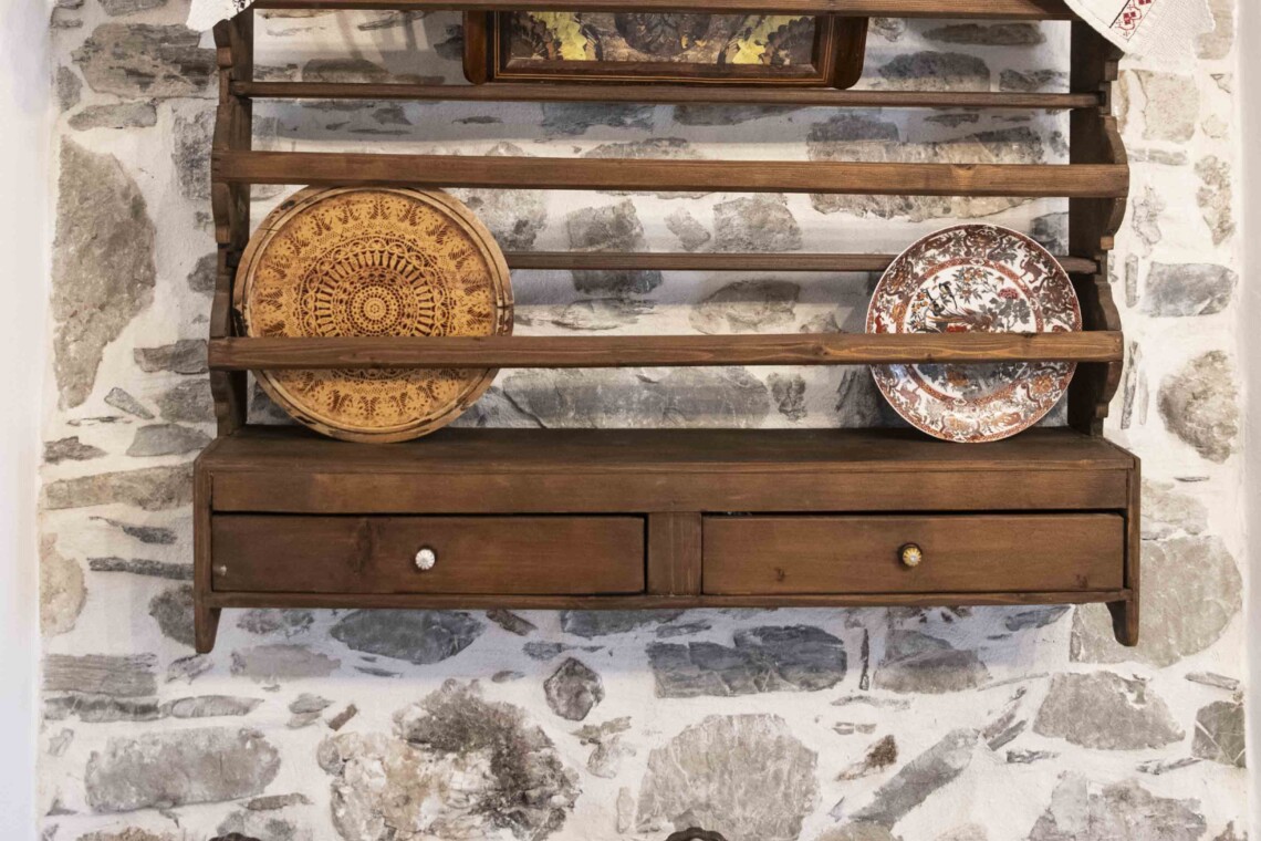 To the left of the entrance is the first bedroom, featuring a cozy bunk bed, perfect for children or additional guests. Adjacent to it, you’ll find the second bedroom, boasting a comfortable double bed crafted from wood sourced from traditional Cretan handlooms. The third bedroom, situated next to the second, offers another serene space for relaxation, with its double bed also made from wood from traditional Cretan handlooms.