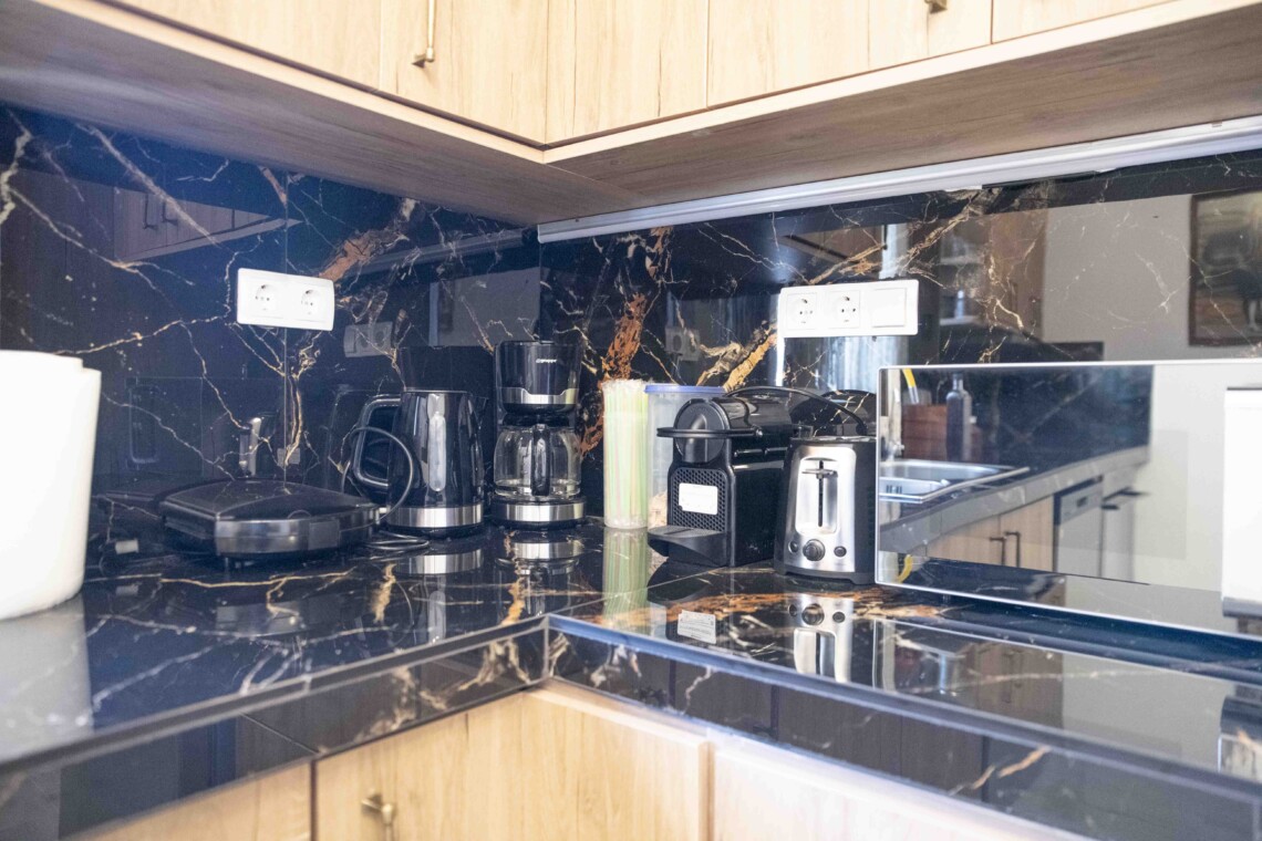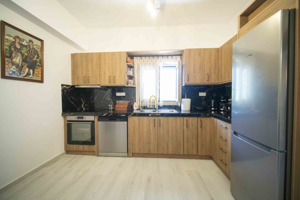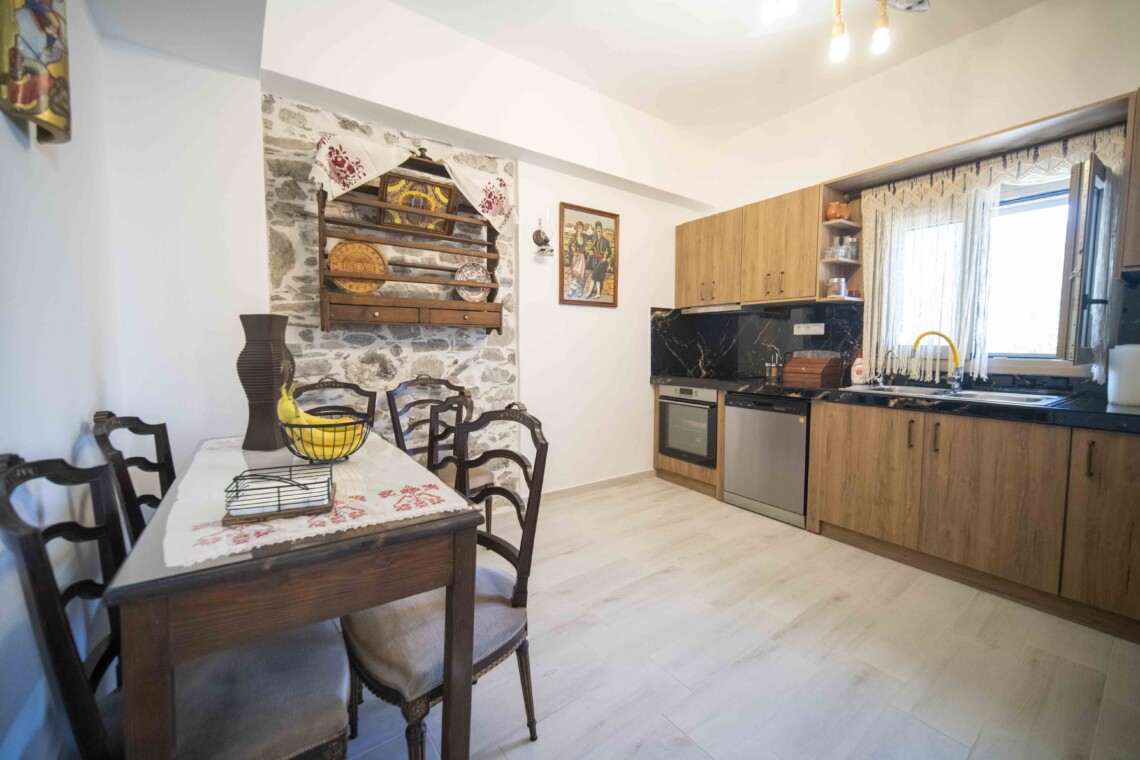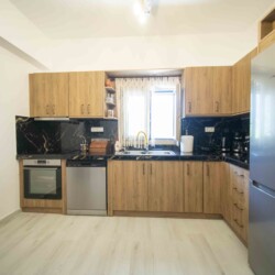 Opposite the third bedroom, at the back of the house, lies the open-plan kitchen. This fully equipped kitchen provides everything you need to prepare delicious meals, allowing you to enjoy the flavors of Crete from the comfort of your home.