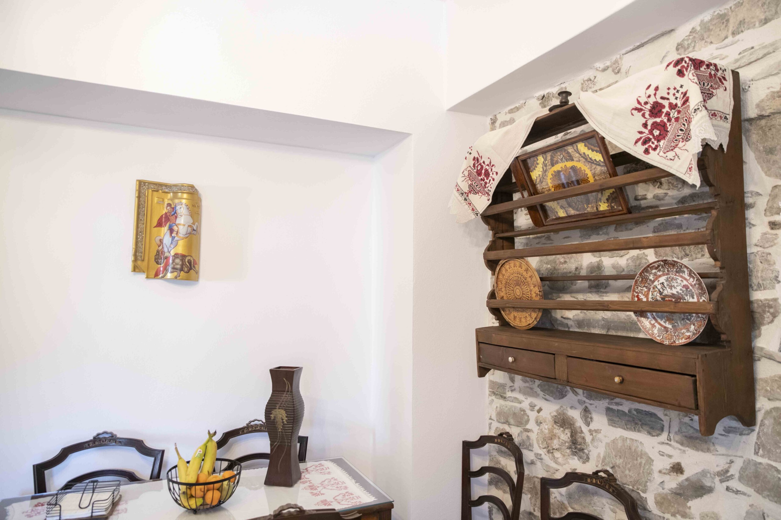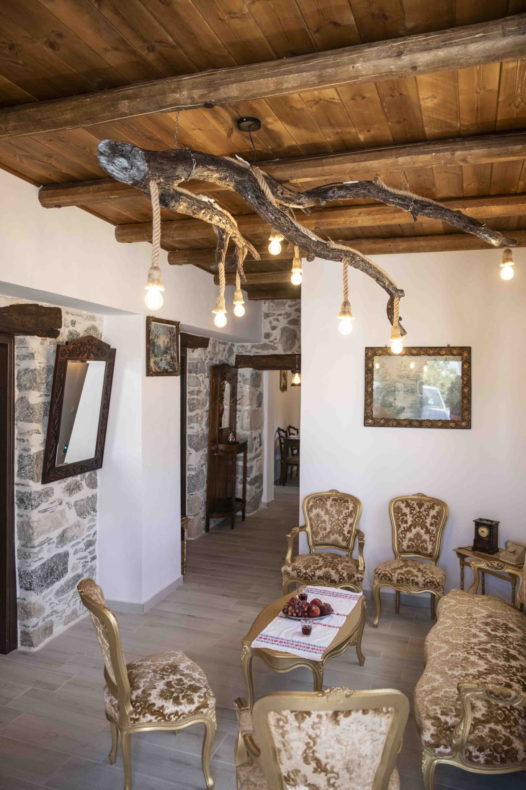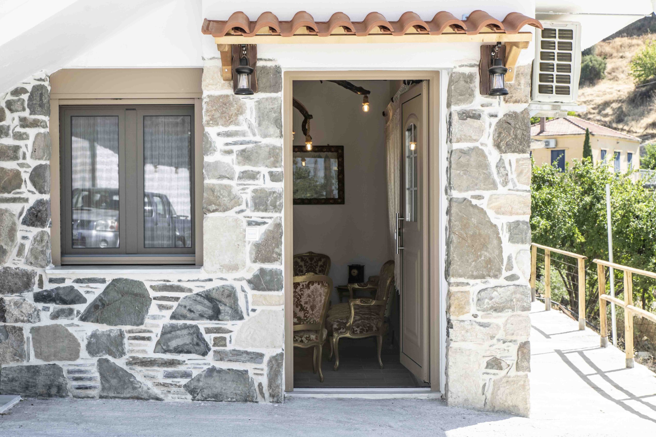 In a traditional village in South Crete, this charming stone house seamlessly blends authentic Cretan architecture with modern comforts. As you step inside, you are greeted by a welcoming seating area, adorned with stylish Cretan-Greek furnishings that exude warmth and hospitality.