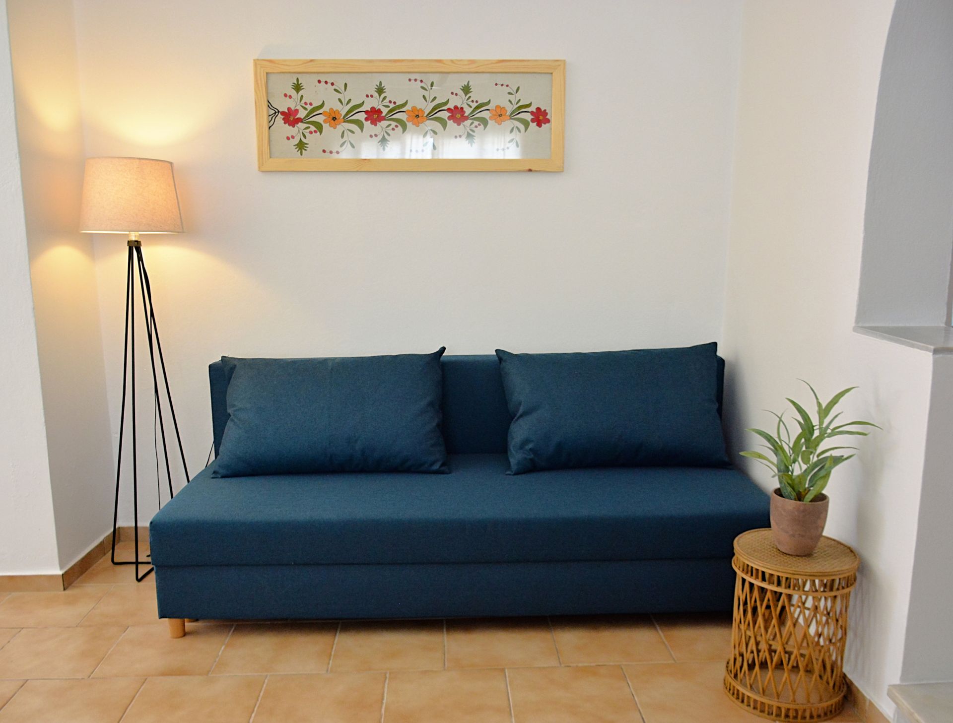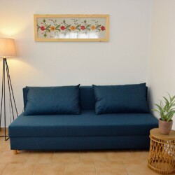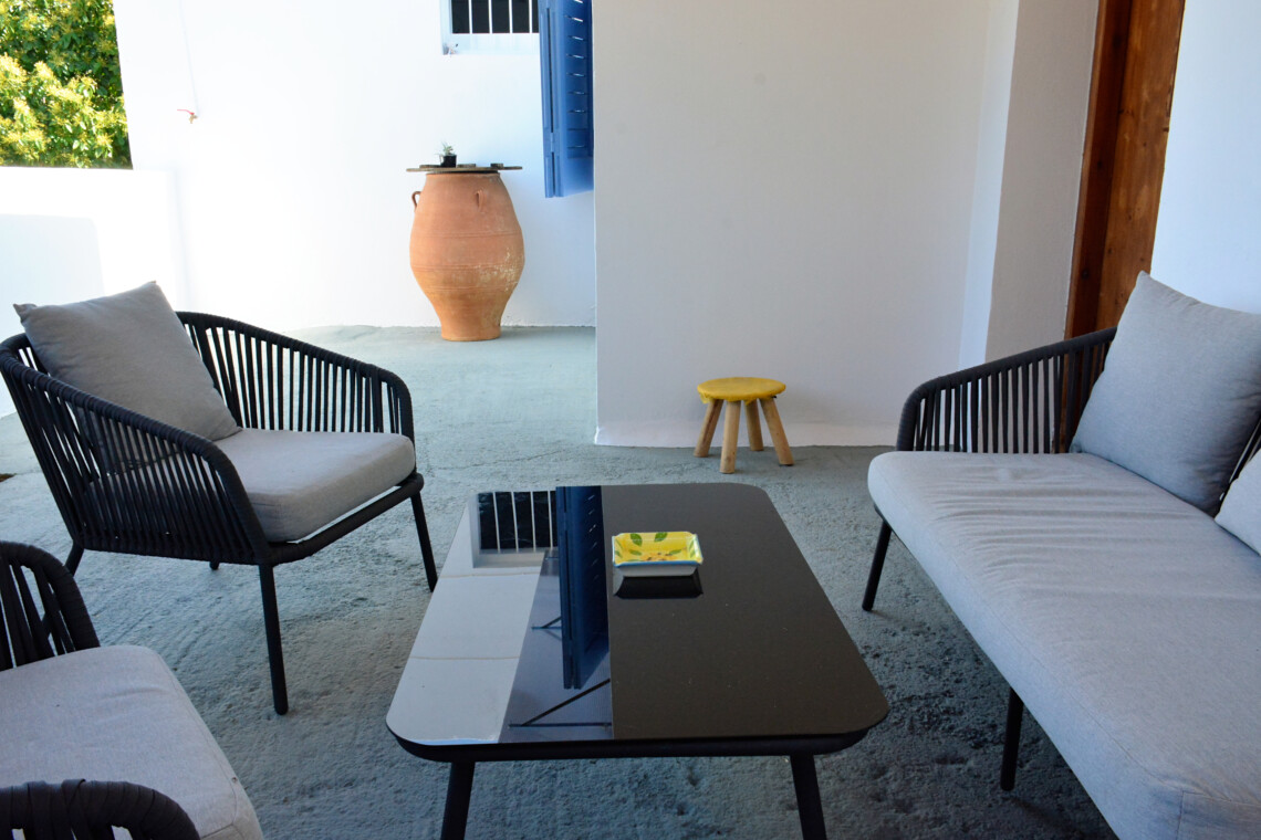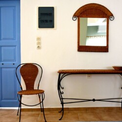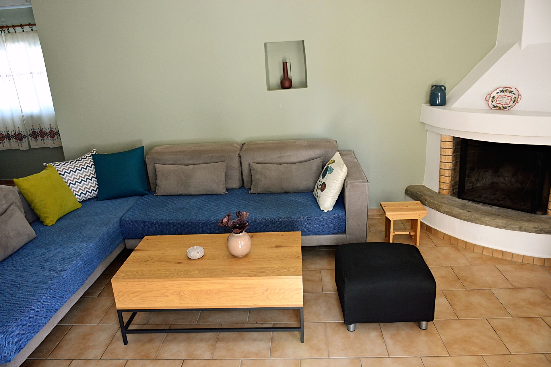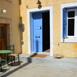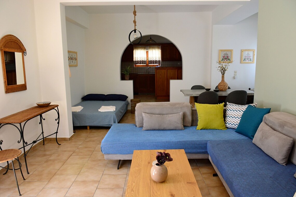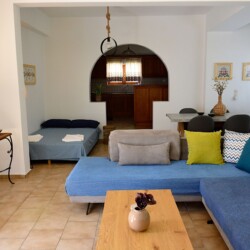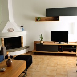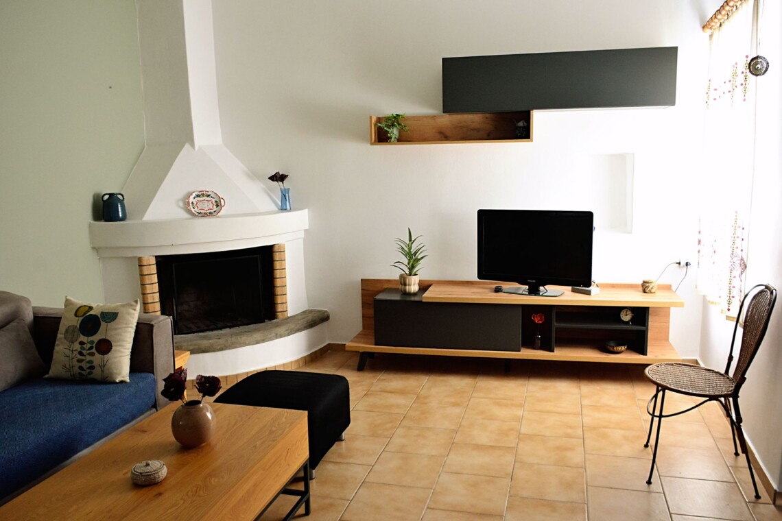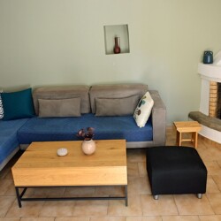 Located in the charming village of Vori in southern Crete, this country house exudes a tranquil allure with its quaint blue front door, welcoming visitors into a world of comfort and relaxation. As you step inside, you’re greeted by the warmth of the living area, where the L-shaped couch and the fireplace invite you to unwind.