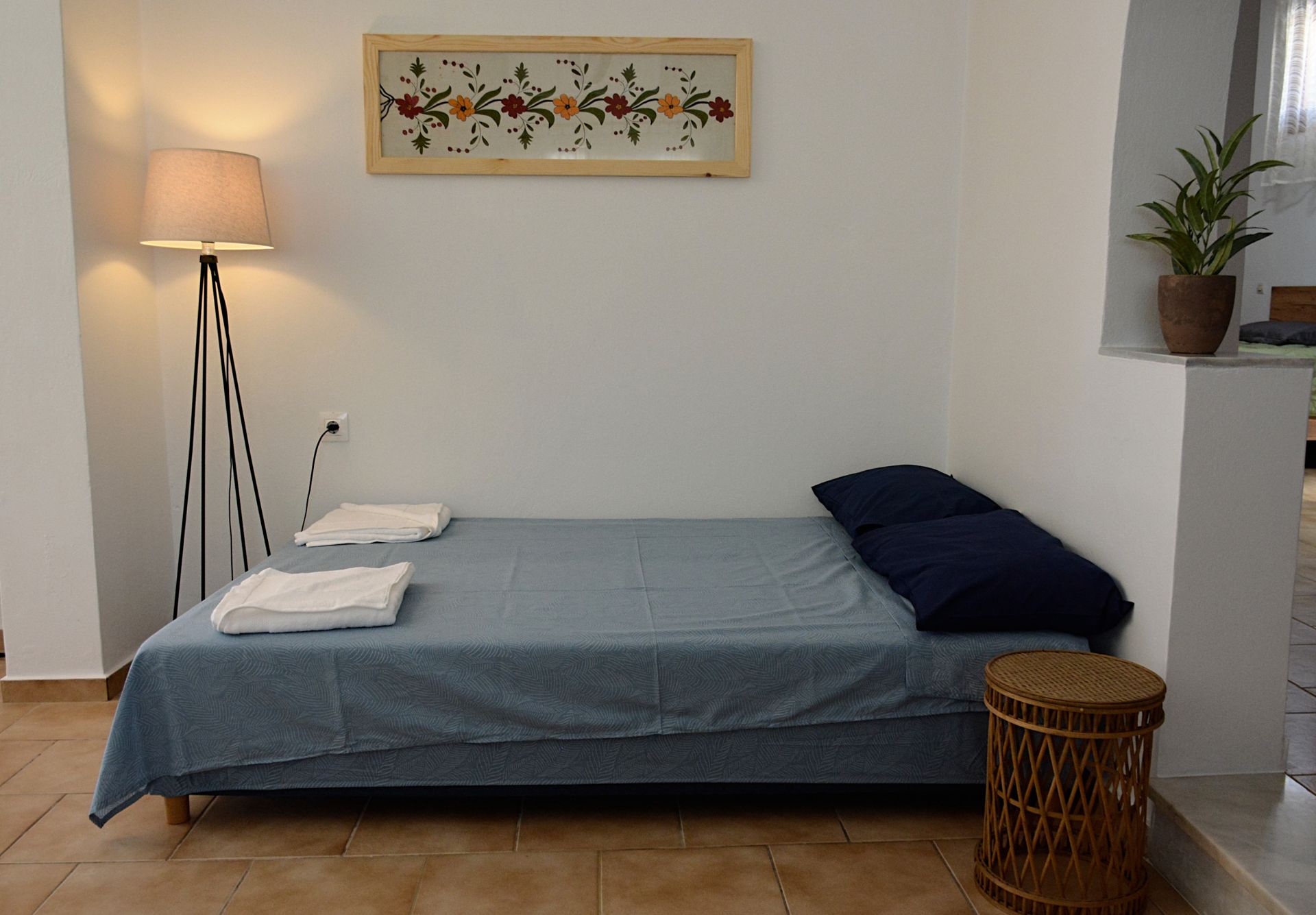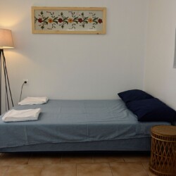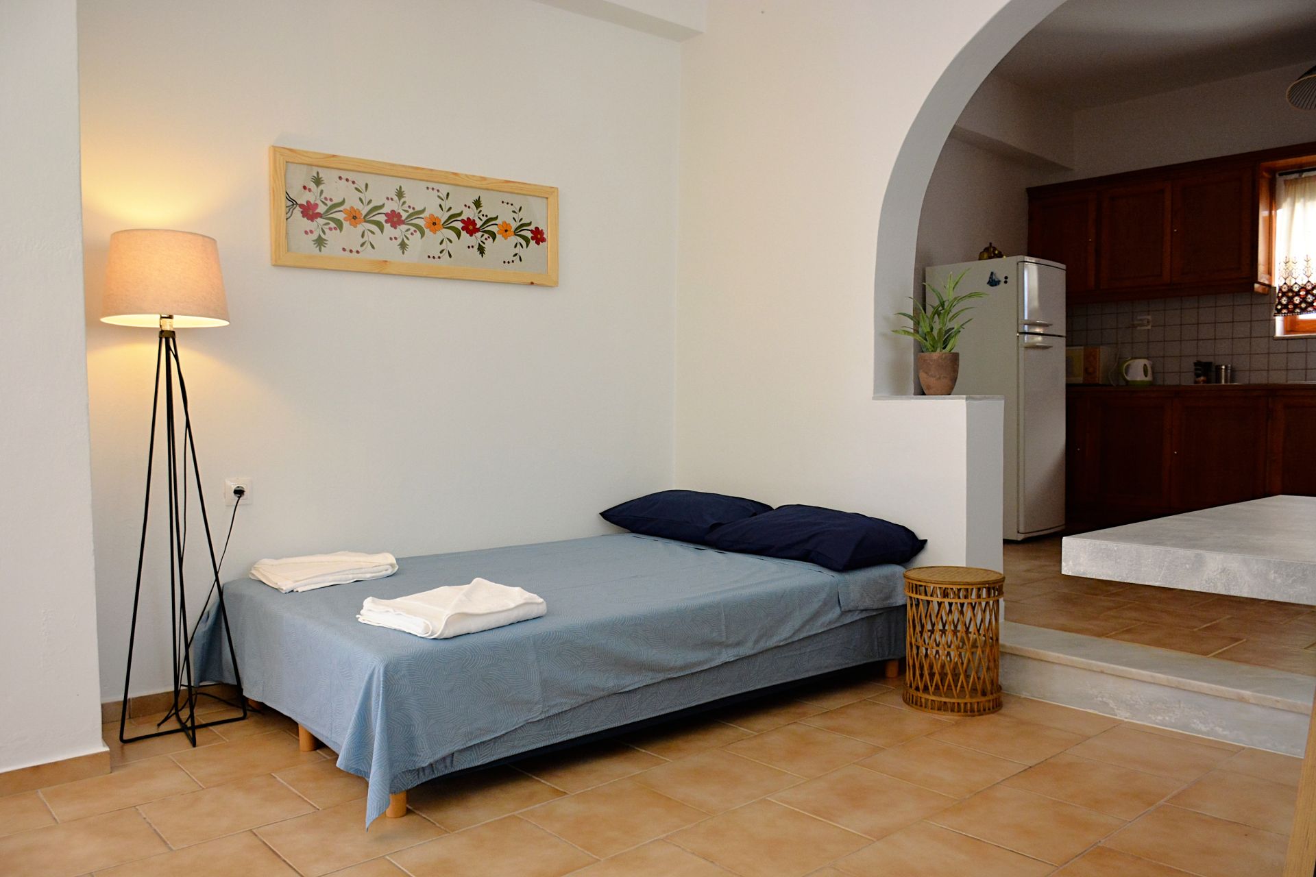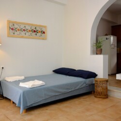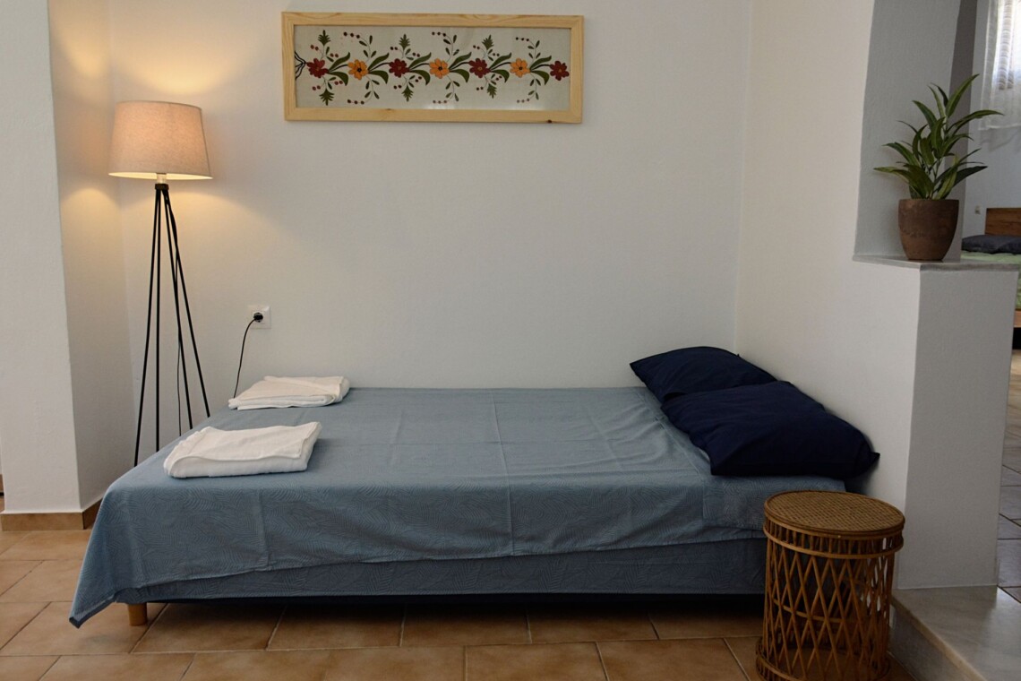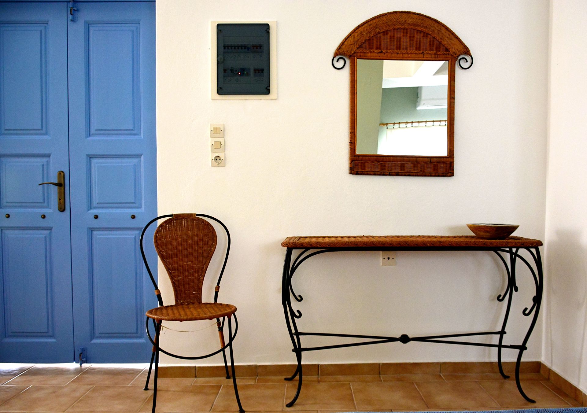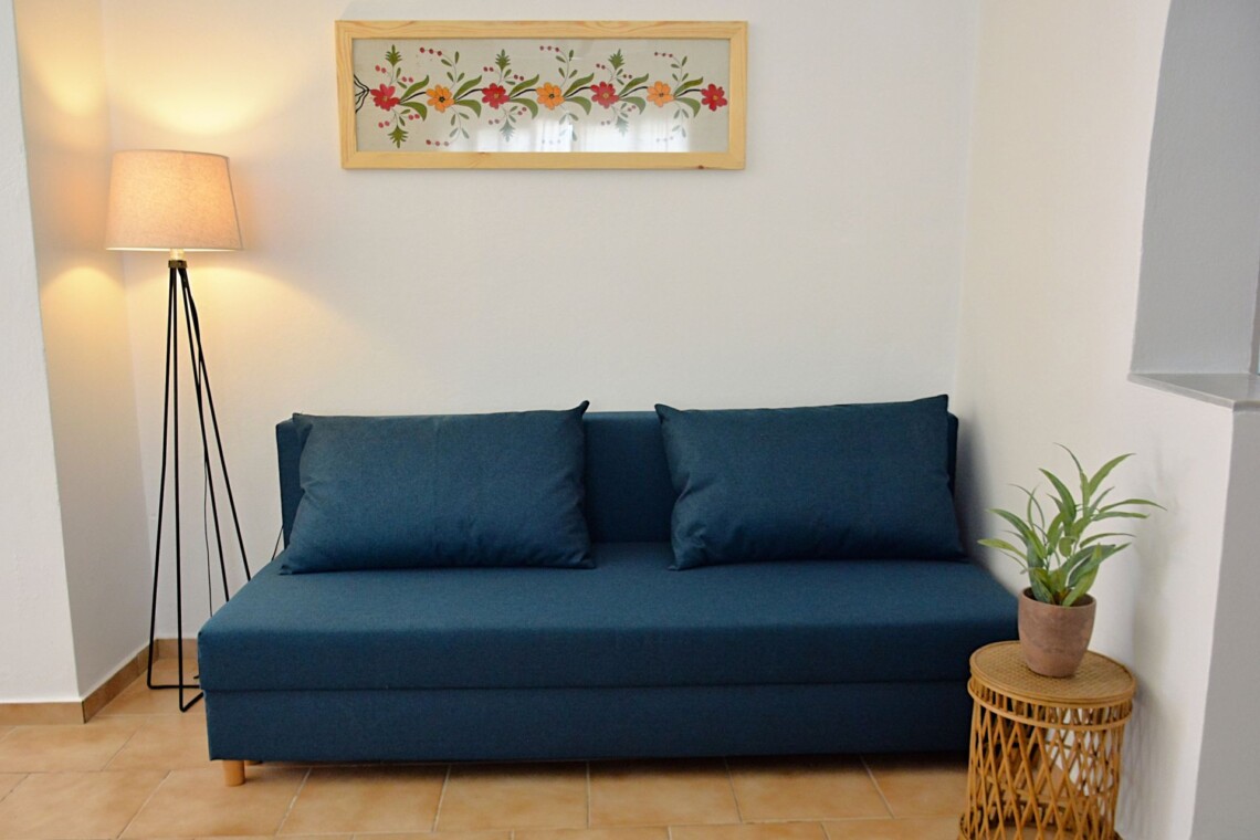 Located in the charming village of Vori in southern Crete, this country house exudes a tranquil allure with its quaint blue front door, welcoming visitors into a world of comfort and relaxation. As you step inside, you’re greeted by the warmth of the living area, where the L-shaped couch and the fireplace invite you to unwind.