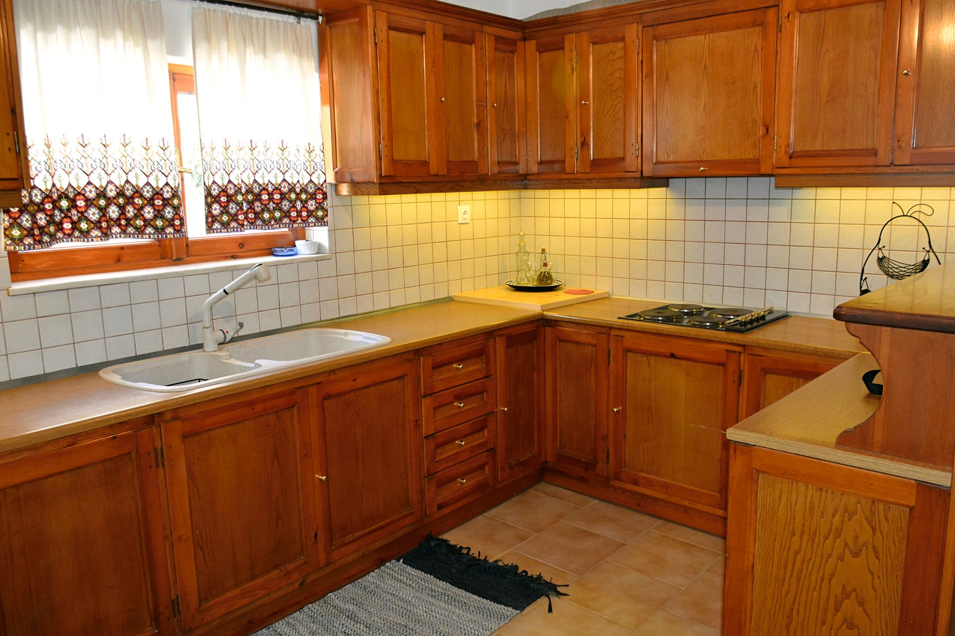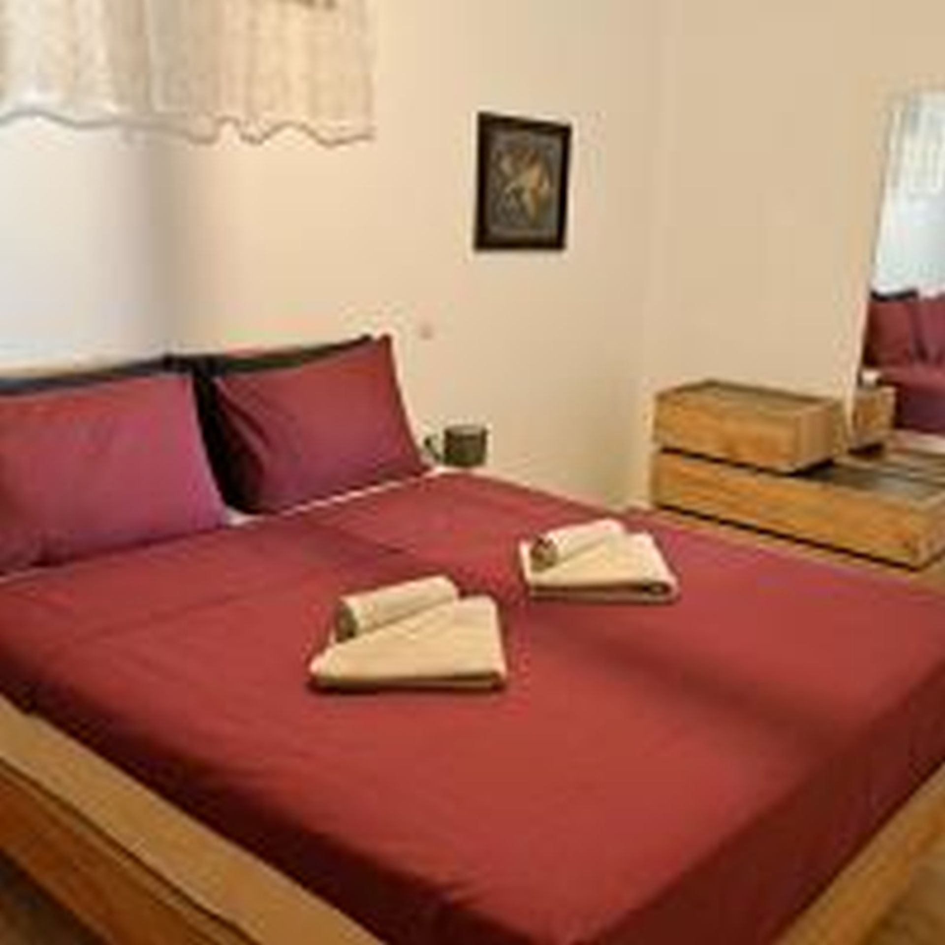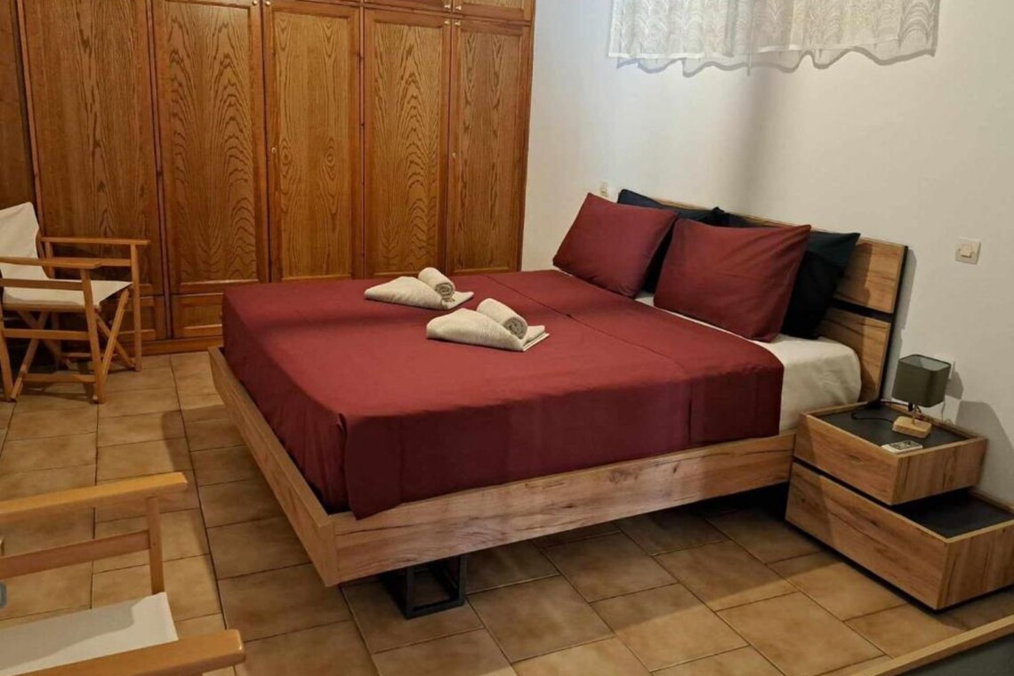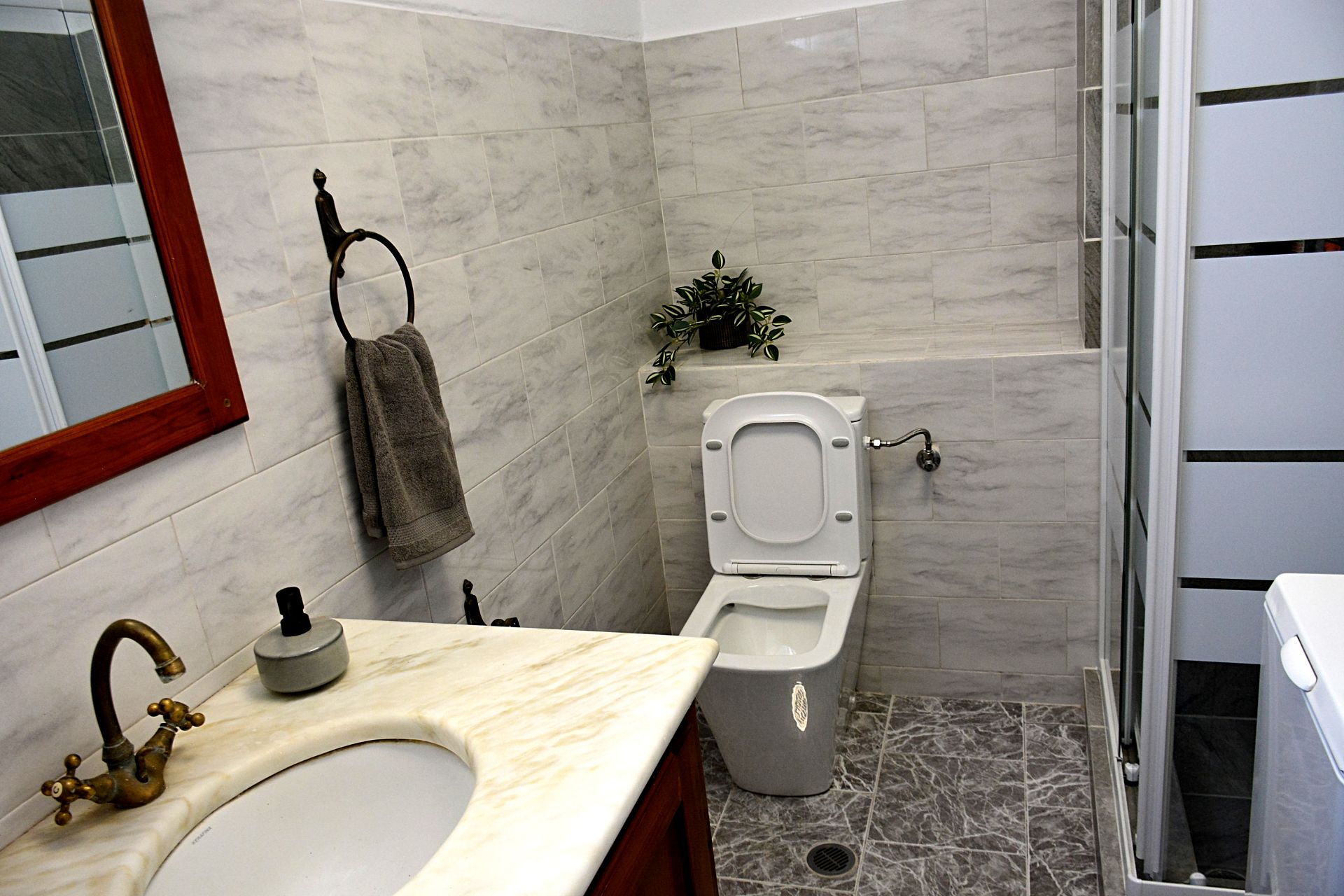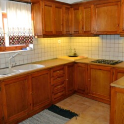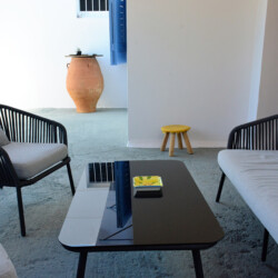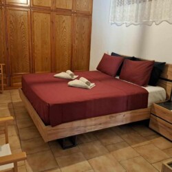 Located in the charming village of Vori in southern Crete, this country house exudes a tranquil allure with its quaint blue front door, welcoming visitors into a world of comfort and relaxation. As you step inside, you’re greeted by the warmth of the living area, where the L-shaped couch and the fireplace invite you to unwind.