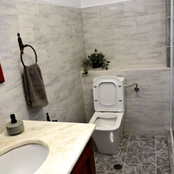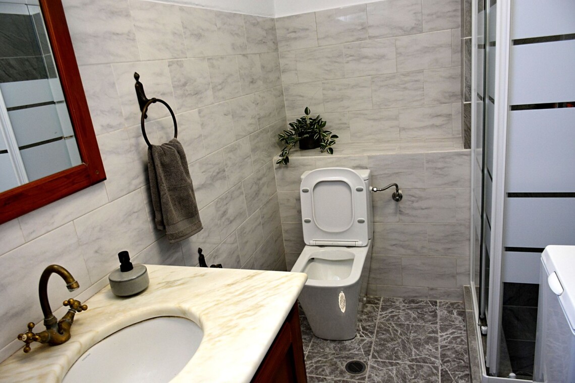 Turning left from the kitchen, you’ll find the large bedroom adorned with a queen-sized bed. Behind the living area, a modern bathroom awaits, boasting a refreshing shower, toilet, and the convenience of a washing machine.
